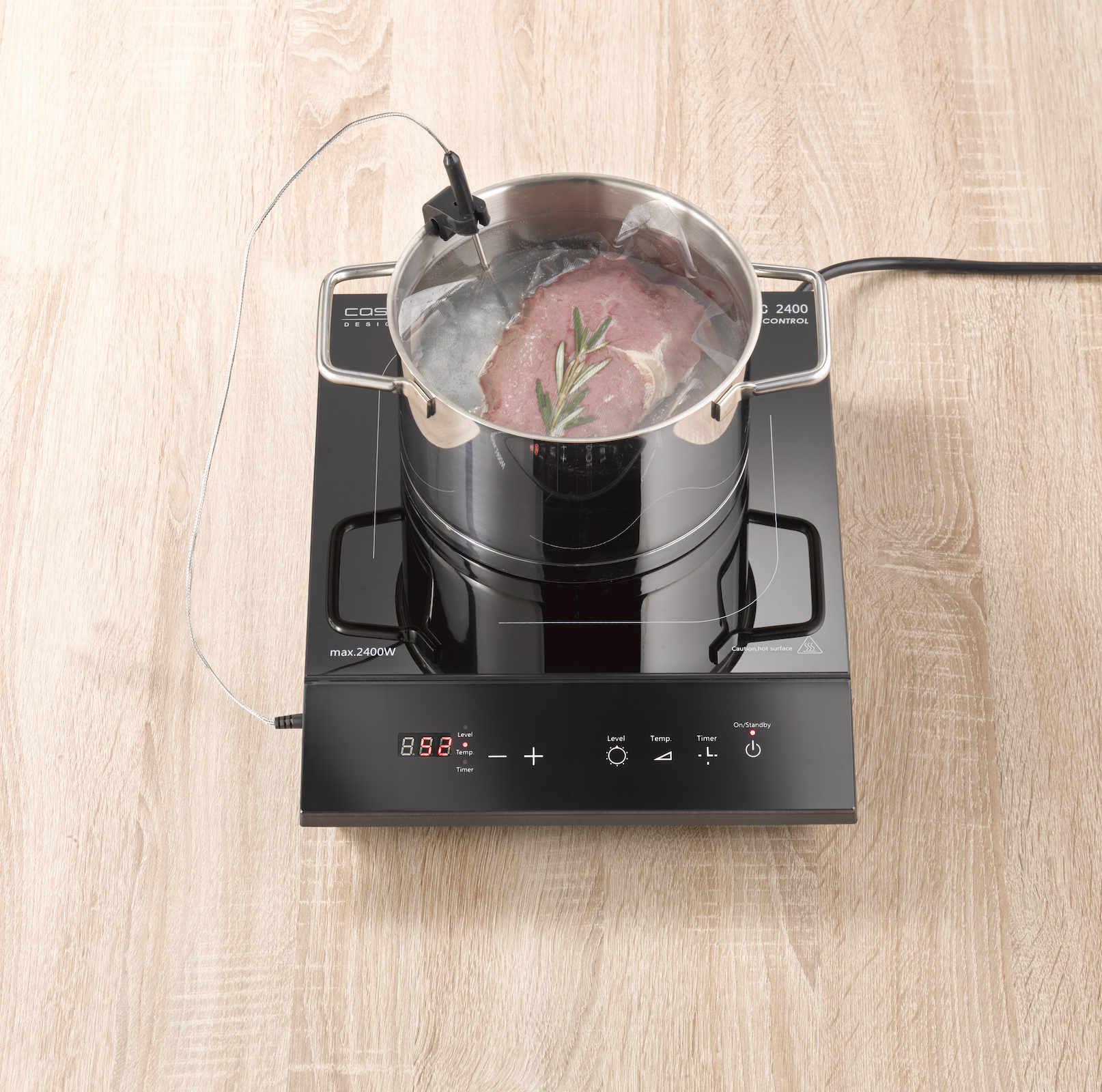 Die neuentwickelte TC 2400 Induktionskochplatte mit Temperaturkontrolle ergänzt das Induktionskochen mit Thermo Control-Thermometer für eine exakte Temperatursteuerung - Schnell, sicher, energiesparend und perfekt kontrolliert.