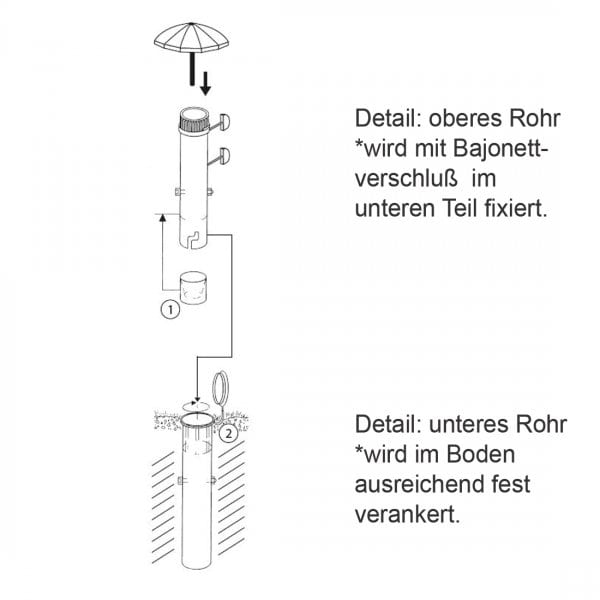 Mit der Bodenhülse von doppler können Sie Ihren Mittelmastschirm einfach befestigen und bei Bedarf das Aufsatzrohr abnehmen und mittels Abdeckkappe verschließen.