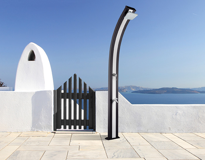 Die vollständig aus Aluminium hergestellte Außendusche Spring passt perfekt zu allen Gärten und Terrassen. Ihr gebogenes Design, ihre Eleganz und ihre Leichtigkeit machen sie zum unverzichtbaren Element für jeden Außenbereich. Sie lässt sich problemlos an jeden Wasserkreislauf anschließen. Die Wärme der Sonne genügt, um ihren 30 Liter großen Wassertank aufzuheizen, weshalb sie vollkommen ökologisch ist.