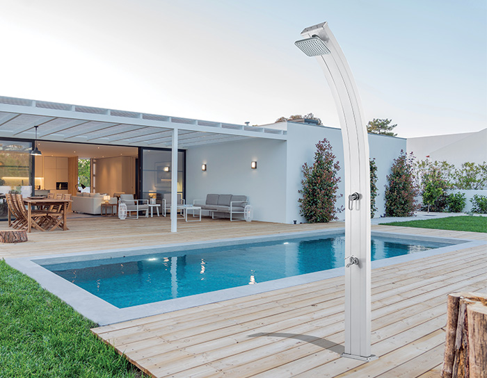 Die vollständig aus Aluminium hergestellte Außendusche Spring passt perfekt zu allen Gärten und Terrassen. Ihr gebogenes Design, ihre Eleganz und ihre Leichtigkeit machen sie zum unverzichtbaren Element für jeden Außenbereich. Sie lässt sich problemlos an jeden Wasserkreislauf anschließen. Die Wärme der Sonne genügt, um ihren 30 Liter großen Wassertank aufzuheizen, weshalb sie vollkommen ökologisch ist.