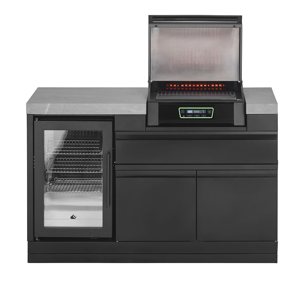 Ausgestattet mit einer hochwertigen Arbeitsplatte aus Sinterstein, die für ein elegantes Aussehen und hervorragende Witterungsbeständigkeit sorgt und einem Outdoor-Kühlschrank, damit Sie Ihre Getränke und Vorräte immer sofort griffbereit haben, lässt diese kompakte Außenküche kaum Wünsche offen. Der Grandpro-Kühlschrank hat ein Fassungsvermögen von 63 Litern, einen niedrigen Energieverbrauch von nur 60 W und ist für die Klimaklasse ST geeignet.