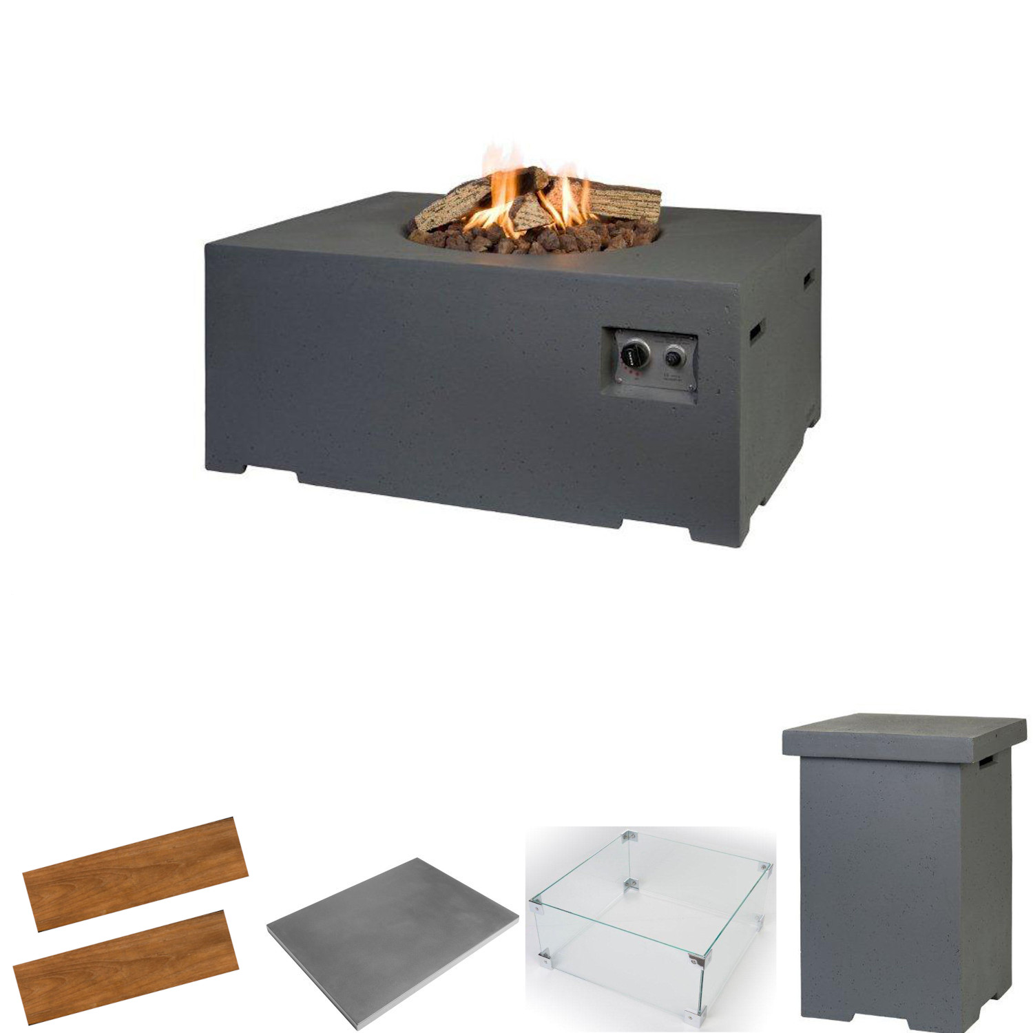 - mit umfangreichem Zubehör: Dekor-Brennholz, Lavasteine, Gasleitung, passende Abdeckhaube, Glasschirm, Deckel für den Tisch, 2 Seitenablagen und Enclosure Beistelltisch