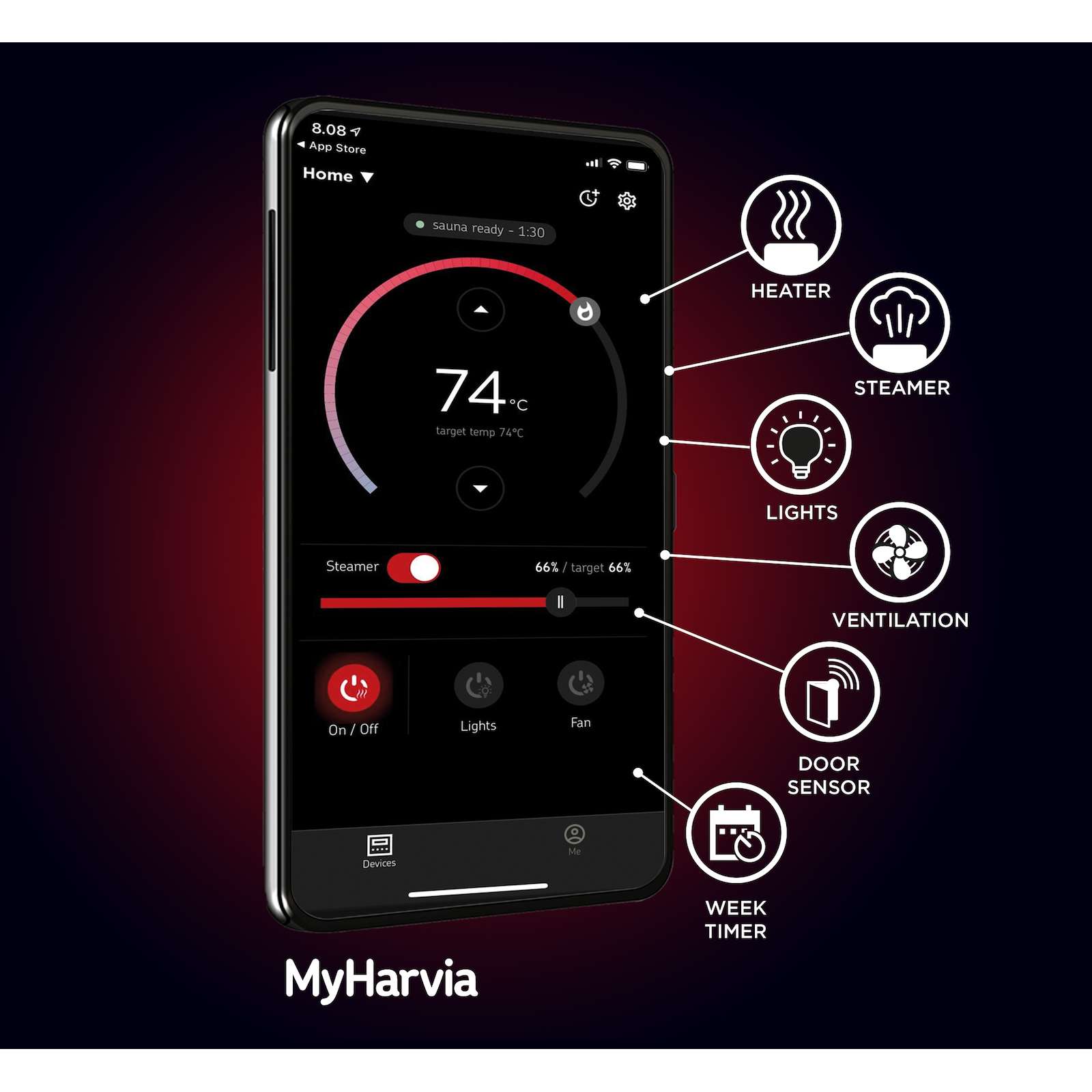 MyHarvia ist eine App für Mobilgeräte, die zur Fernsteuerung von Saunen entwickelt wurde. Sie ermöglicht es, den Saunaofen, die Beleuchtung und die Ventilation fernzusteuern.