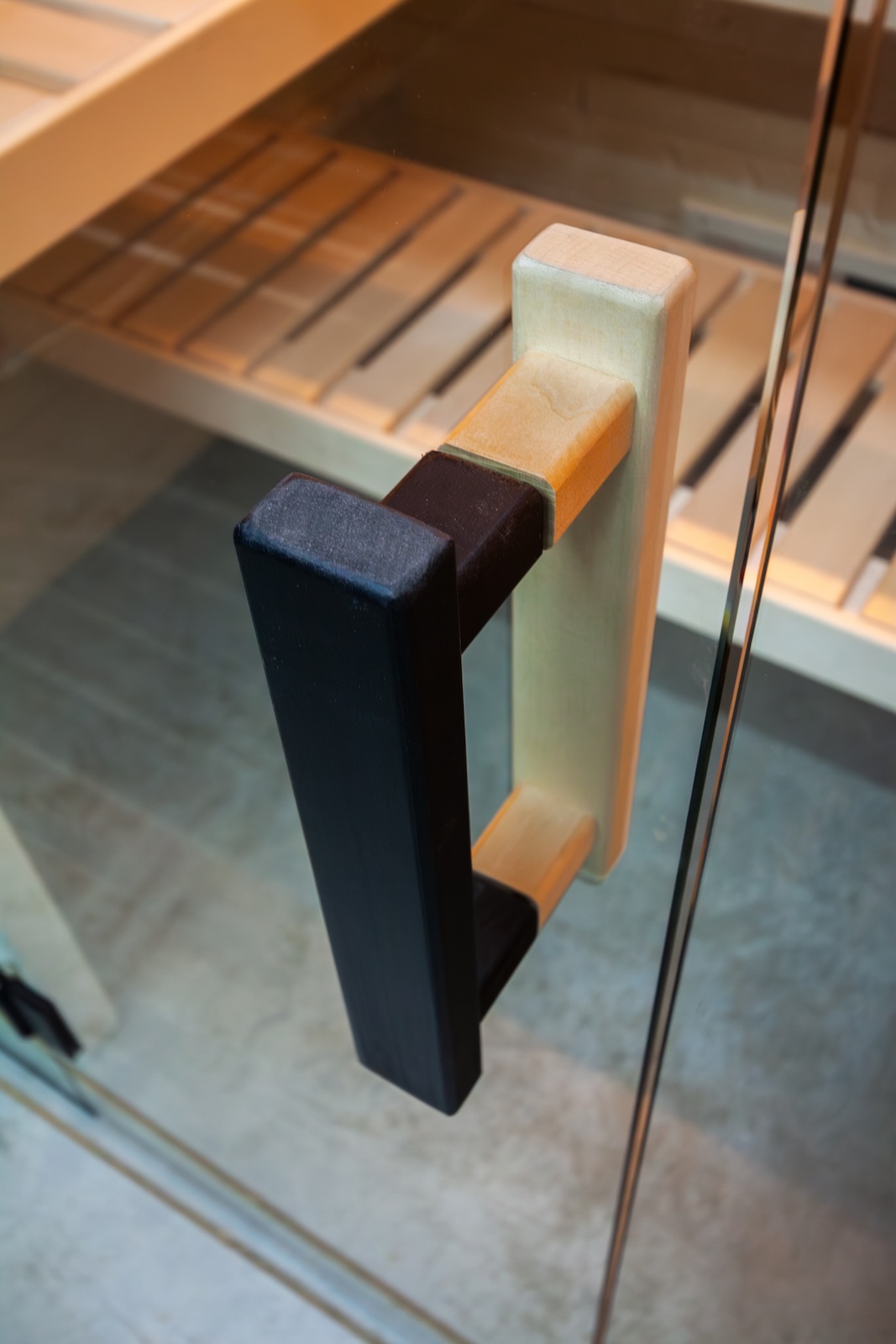 - Tür aus 8 mm ESG Klarglas, Türgriff Holz Linde/Holz schwarz