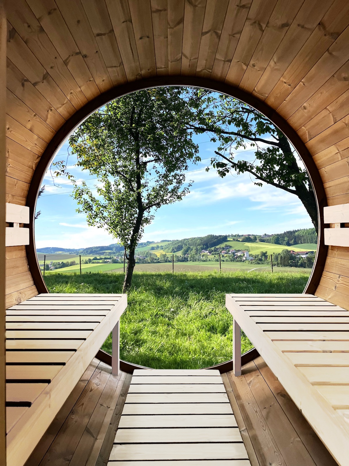Mit der modernen View Fasssauna "Kaski" holst du das finnische Saunaerlebnis zu dir nachhause. Dank der natürlichen Form fügt sich das Fass in jeden Garten ein und bietet Platz für bis zu 4 Personen. Durch den kompletten Glasausschnitt auf der Rückseite wirkt das Fass nicht nur deutlich größer, es bietet Ihnen auch eine schöne Sicht nach draußen. Das Thermo-Kiefernholz und die Schindeln aus Bitumen machen die Gartensauna ideal für den Außenbereich. Im Lieferumfang ist ein weißes LED Licht für einen angenehmen entspannenden Saunagang enthalten.
