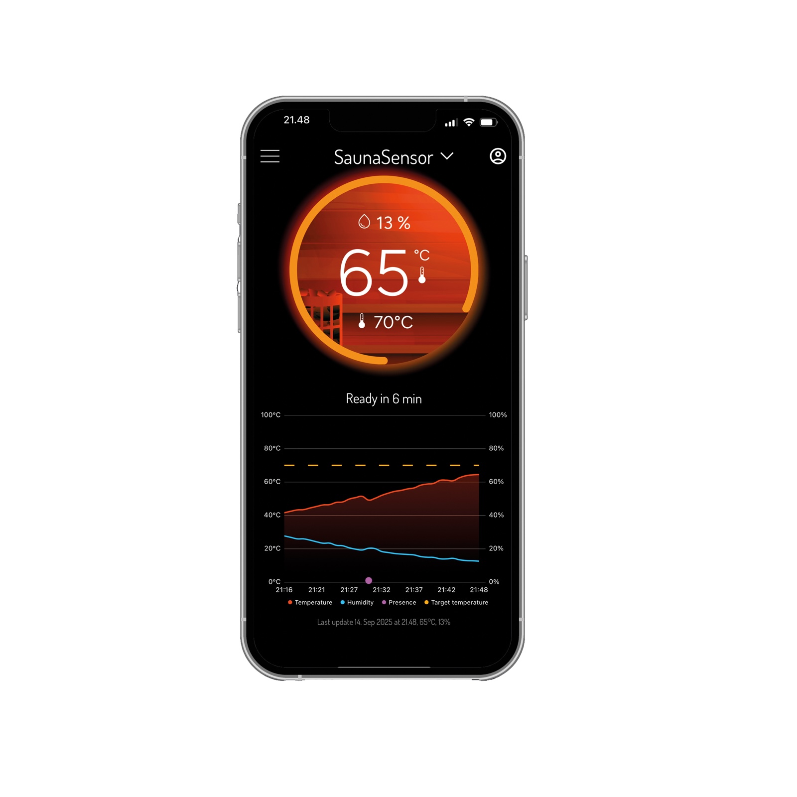 - Verfolgen Sie Temperatur, Luftfeuchtigkeit und Nutzung (PIR-Bewegungssensor) und sehen Sie genau, wann Ihre Sauna startbereit ist