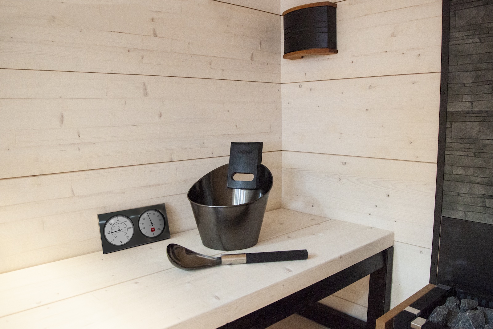 - Sauna-Zubehörpaket bestehend aus einem Saunaeimer, Schöpfkelle und Thermo- und Hygrometer