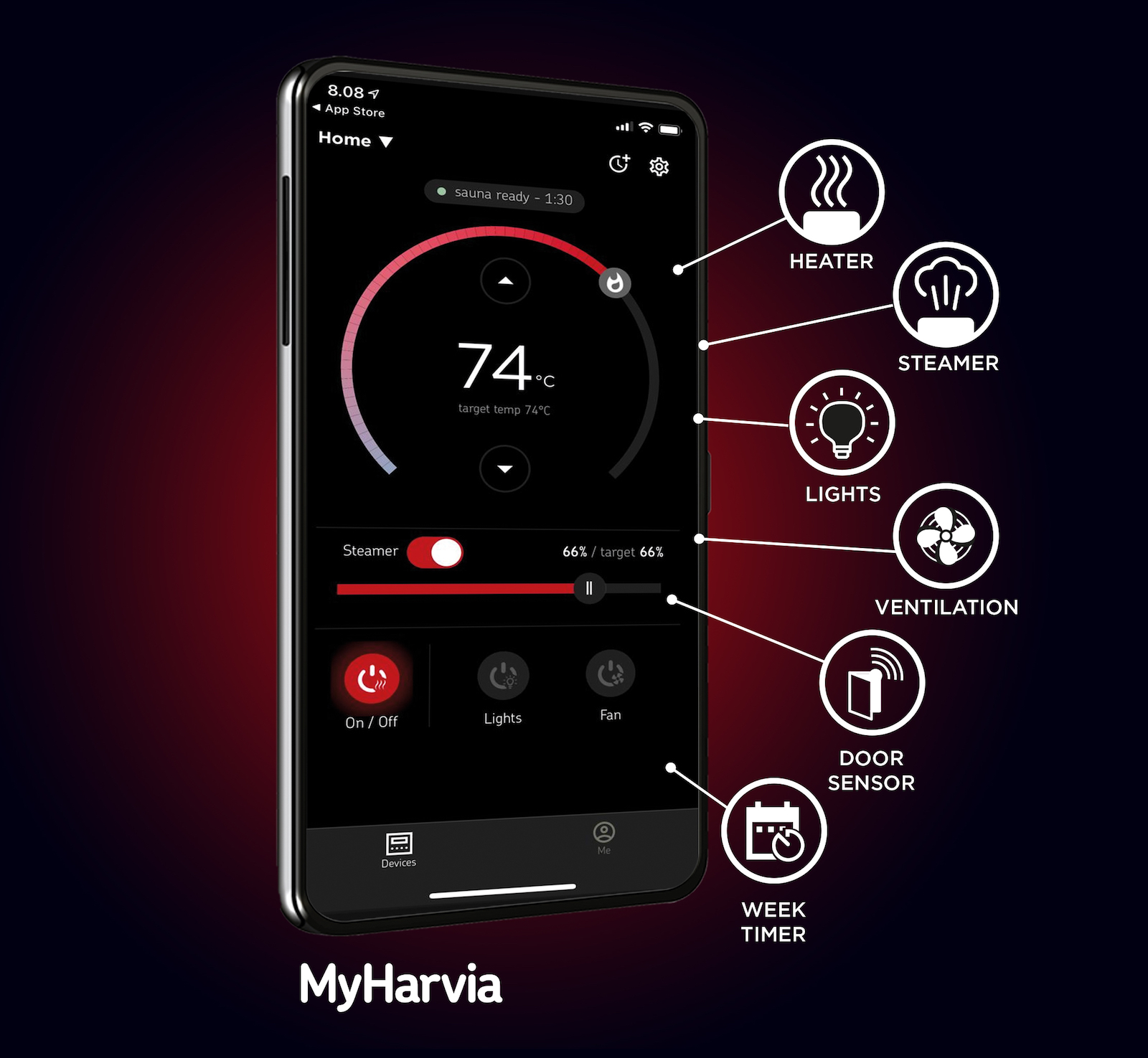 MyHarvia ist eine App für Mobilgeräte, die zur Fernsteuerung von Saunen entwickelt wurde. Sie ermöglicht es, den Saunaofen, die Beleuchtung und die Ventilation fernzusteuern.