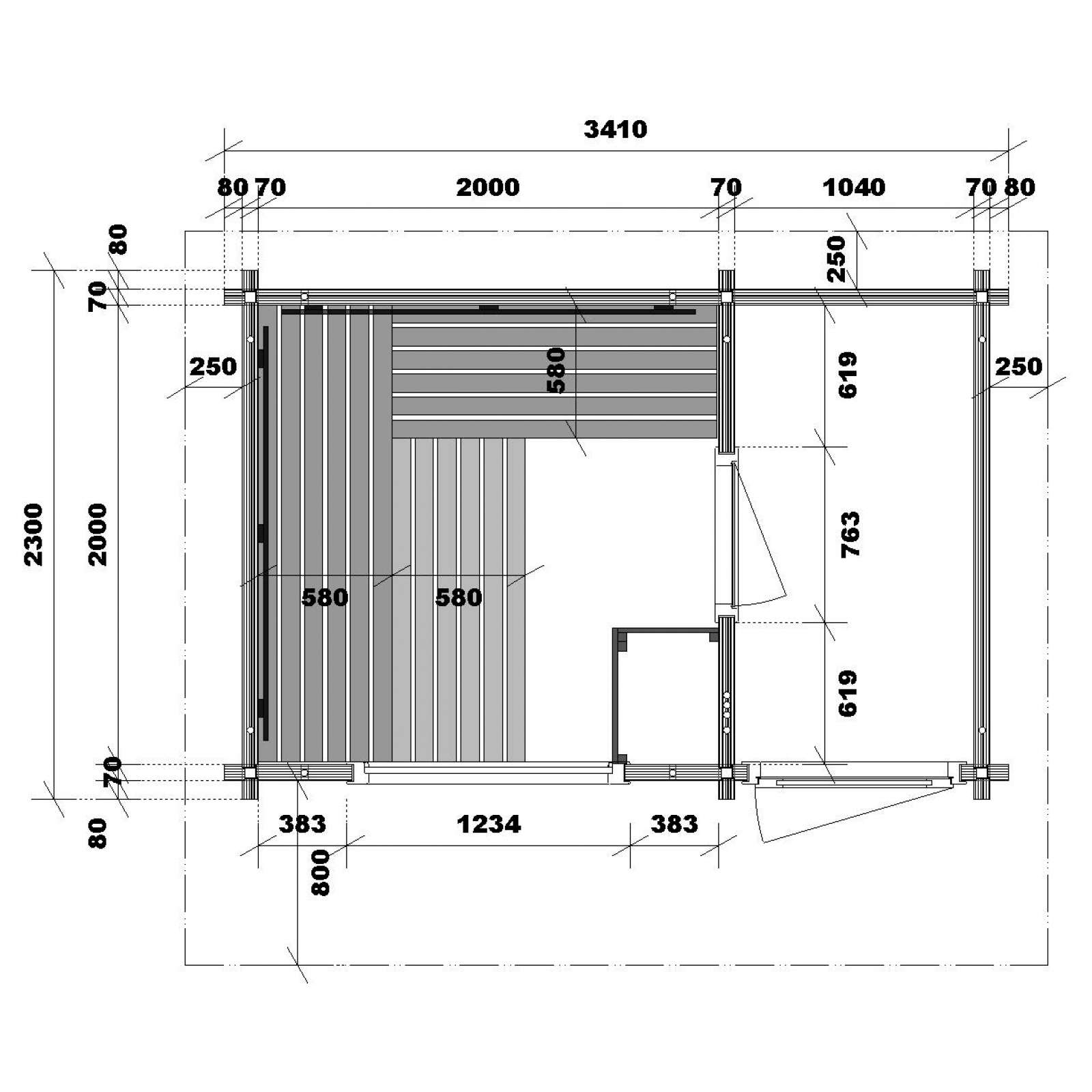 - Außenmaß mit Ecküberstand: 3410 x 2300 mm