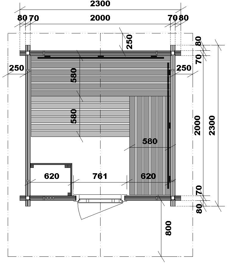 - Außenmaß mit Ecküberstand: 2300 x 2300 mm