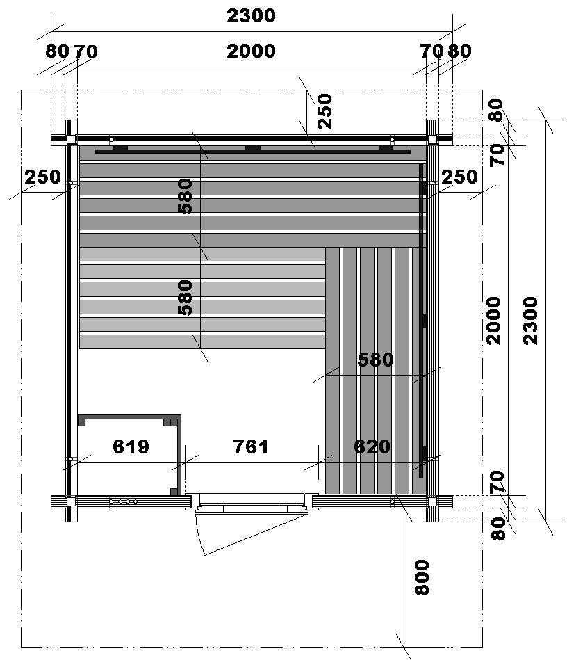 - Außenmaß mit Ecküberstand: 2300 x 2300 mm