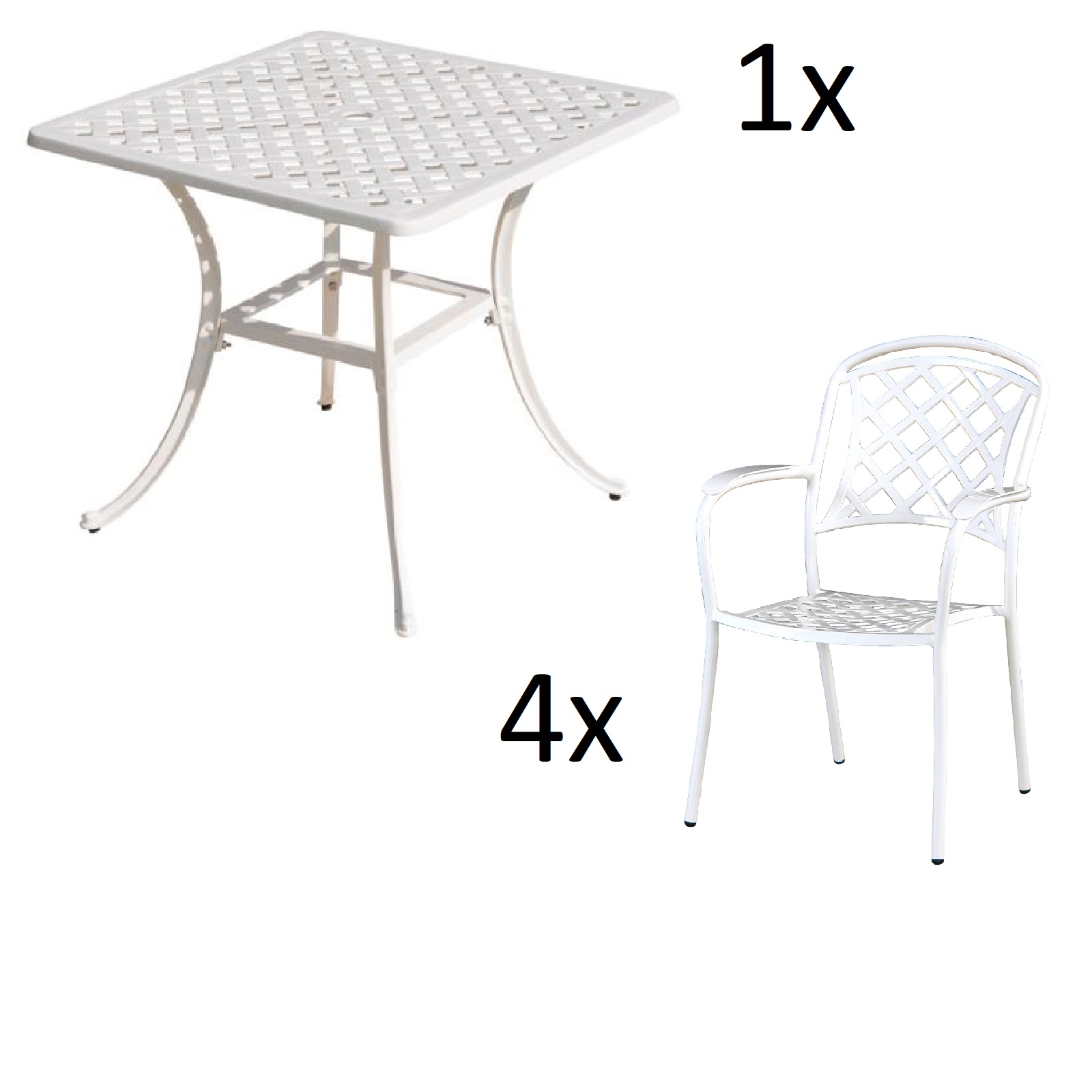 - romantisches, klassisches Design - aus hochwertigem Aluminium-Guss in weiß - Tisch: ca. 80x80x74 cm (BxTxH) - vier verschiedene Sessel zur Auswahl (teilweise gegen Aufpreis) - einfache Reinigung - witterungsbeständig