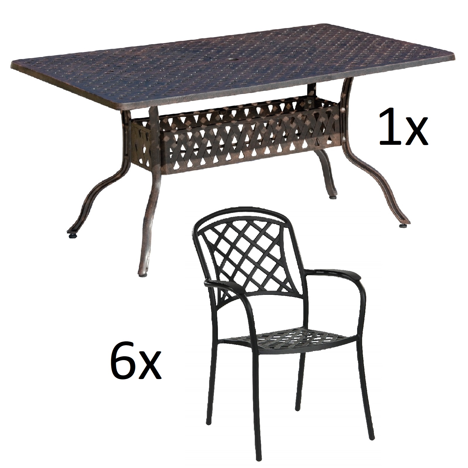 1x Inko Sitzgruppe Alu-Guss bronze bestehend aus 1x Tisch 150x97x74 cm und 6x dem gewählten Sessel