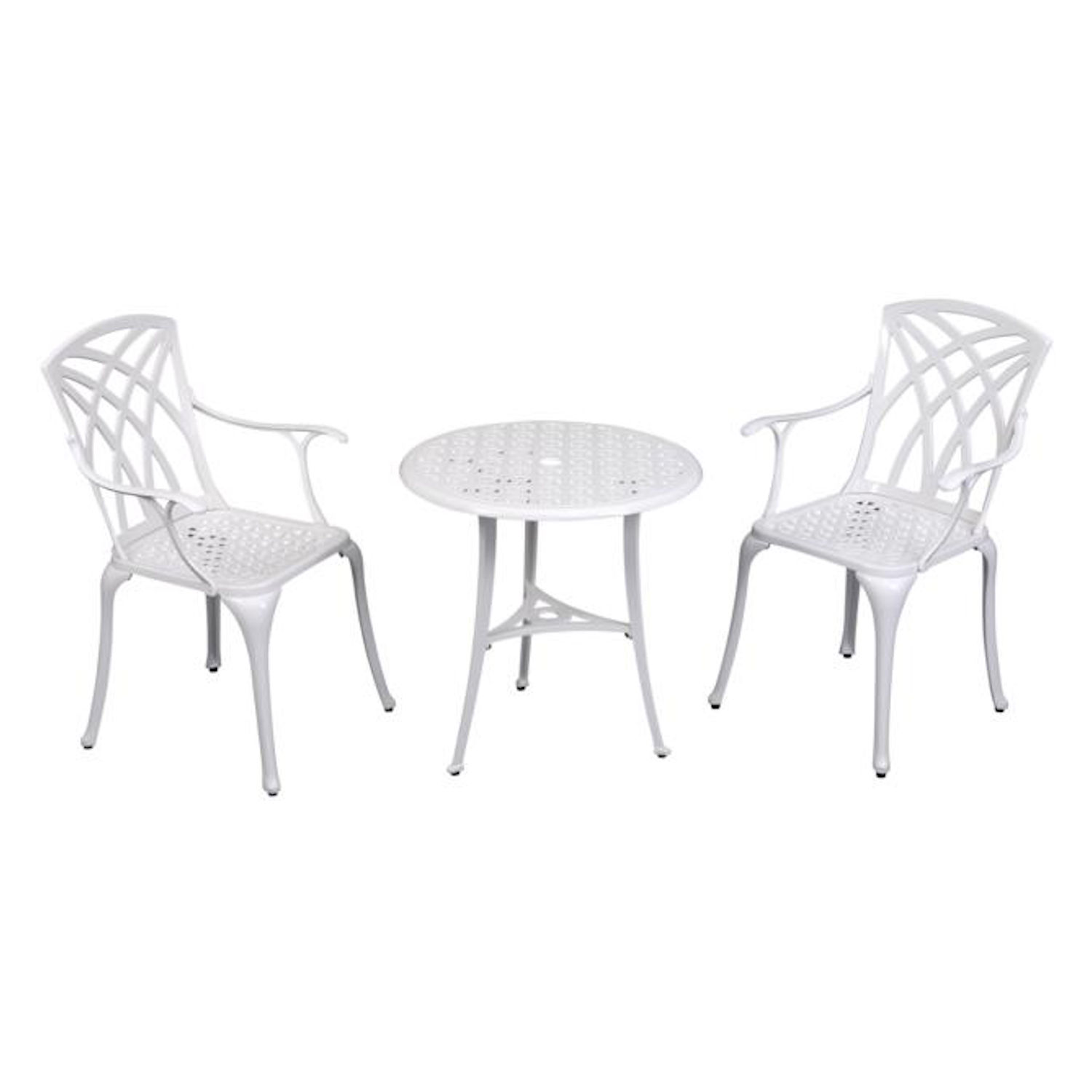 - Bestehend aus zwei Stühlen mit Armlehnen und einem runden Tisch