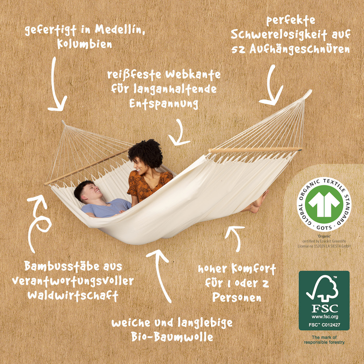 Sie bietet hohen Liegekomfort und ist durch ihre Wetterbeständigkeit besonders für den Gebrauch in der freien Natur geeignet. Sie ist aus nachhaltiger Bio-Baumwolle gefertigt, was für ein angenehmes Hautgefühl sorgt und die Hängematte besonders pflegeleicht macht. Durch verstärkte Webkanten ist sie besonders reißfest.
