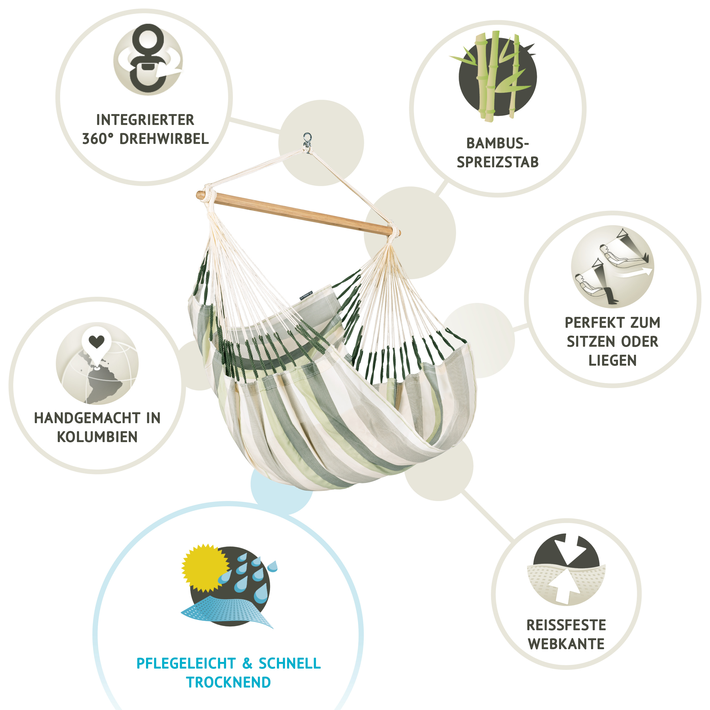 Er bietet hohen Liegekomfort und ist durch seine Wetterbeständigkeit besonders für den Gebrauch in der freien Natur geeignet. Der Hängestuhl ist aus HamacTex hergestellt, einer speziell für Hängesessel entwickelten Polypropylen-Faser. Diese ähnelt der Baumwolle, ist jedoch wetterbeständiger und trocknet schneller. Durch verstärkte Webkanten ist er besonders reißfest. Der Spreizstab ist aus hochwertigem Bambusholz hergestellt und setzt ein optisches Highlight.