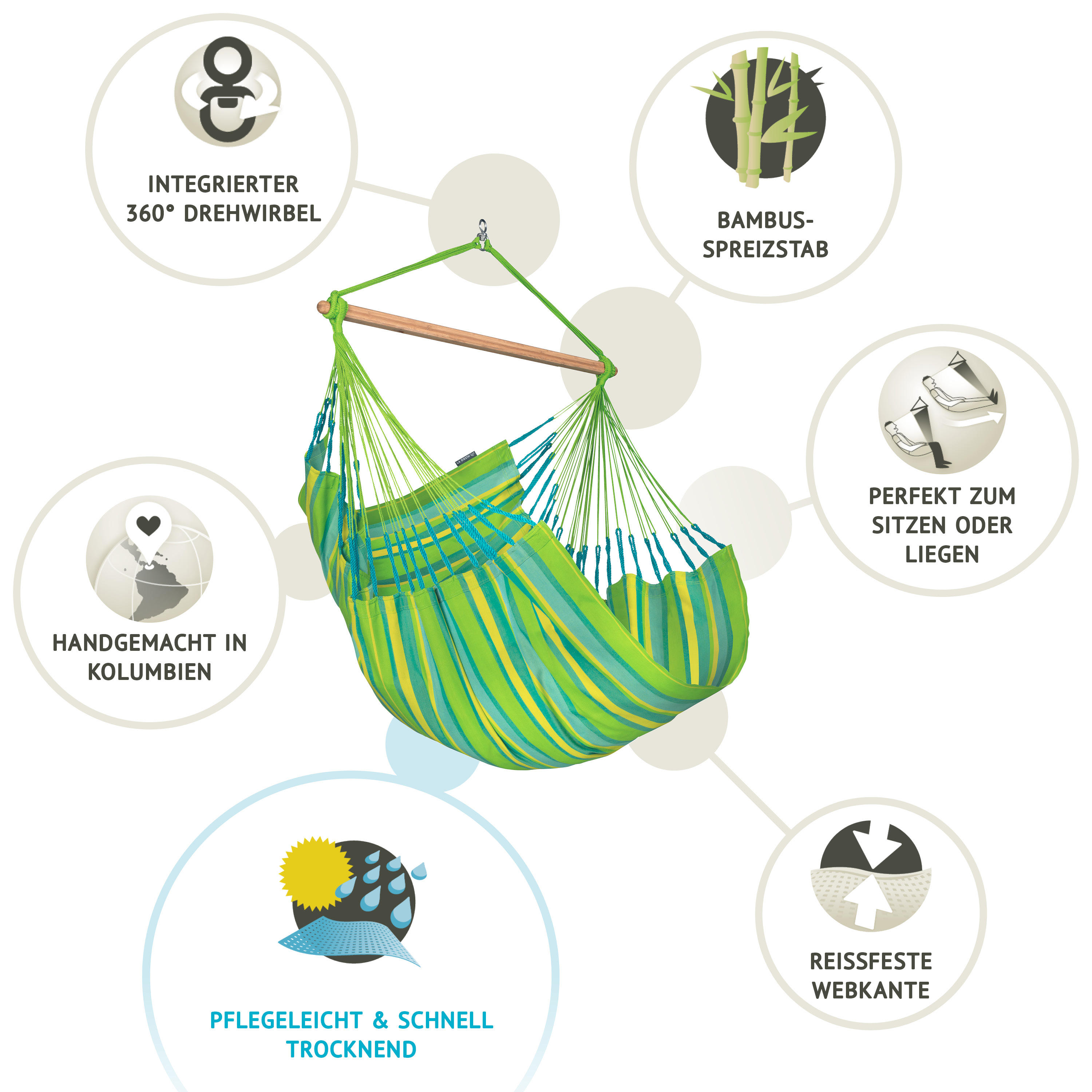 Er bietet hohen Liegekomfort und ist durch seine Wetterbeständigkeit besonders für den Gebrauch in der freien Natur geeignet. Der Hängestuhl ist aus HamacTex hergestellt, einer speziell für Hängesessel entwickelten Polypropylen-Faser. Diese ähnelt der Baumwolle, ist jedoch wetterbeständiger und trocknet schneller. Durch verstärkte Webkanten ist er besonders reißfest. Der Spreizstab ist aus hochwertigem Bambusholz hergestellt und setzt ein optisches Highlight.