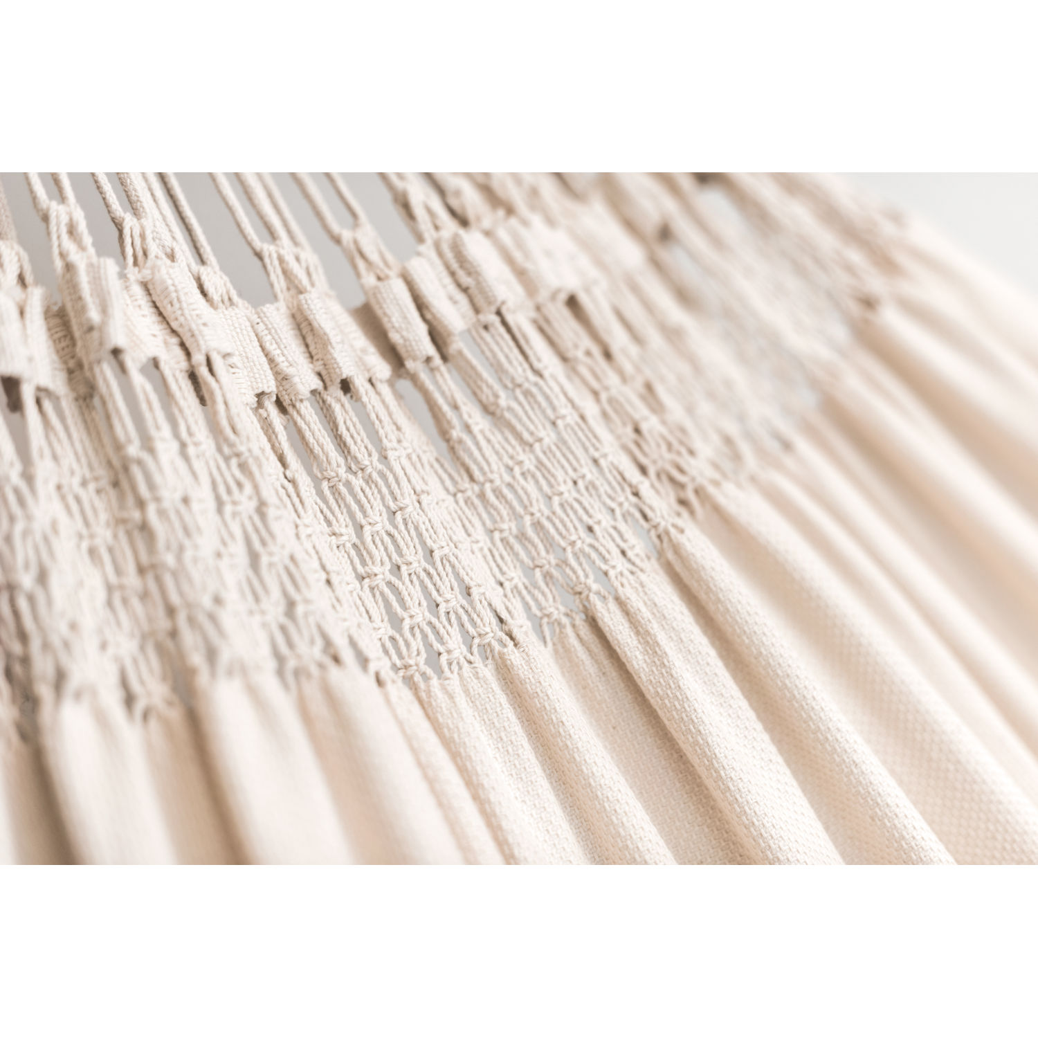 Sie bietet hohen Liegekomfort und ist durch ihre exklusiven Zierborten und das Macramé zwischen Tuch und den Aufhängeschnüren ein besonderer Hingucker. Sie ist aus hochwertiger Bio-Baumwolle gefertigt, was für ein angenehmes Hautgefühl sorgt und die Hängematte besonders pflegeleicht macht. Durch verstärkte Webkanten ist sie besonders reißfest.