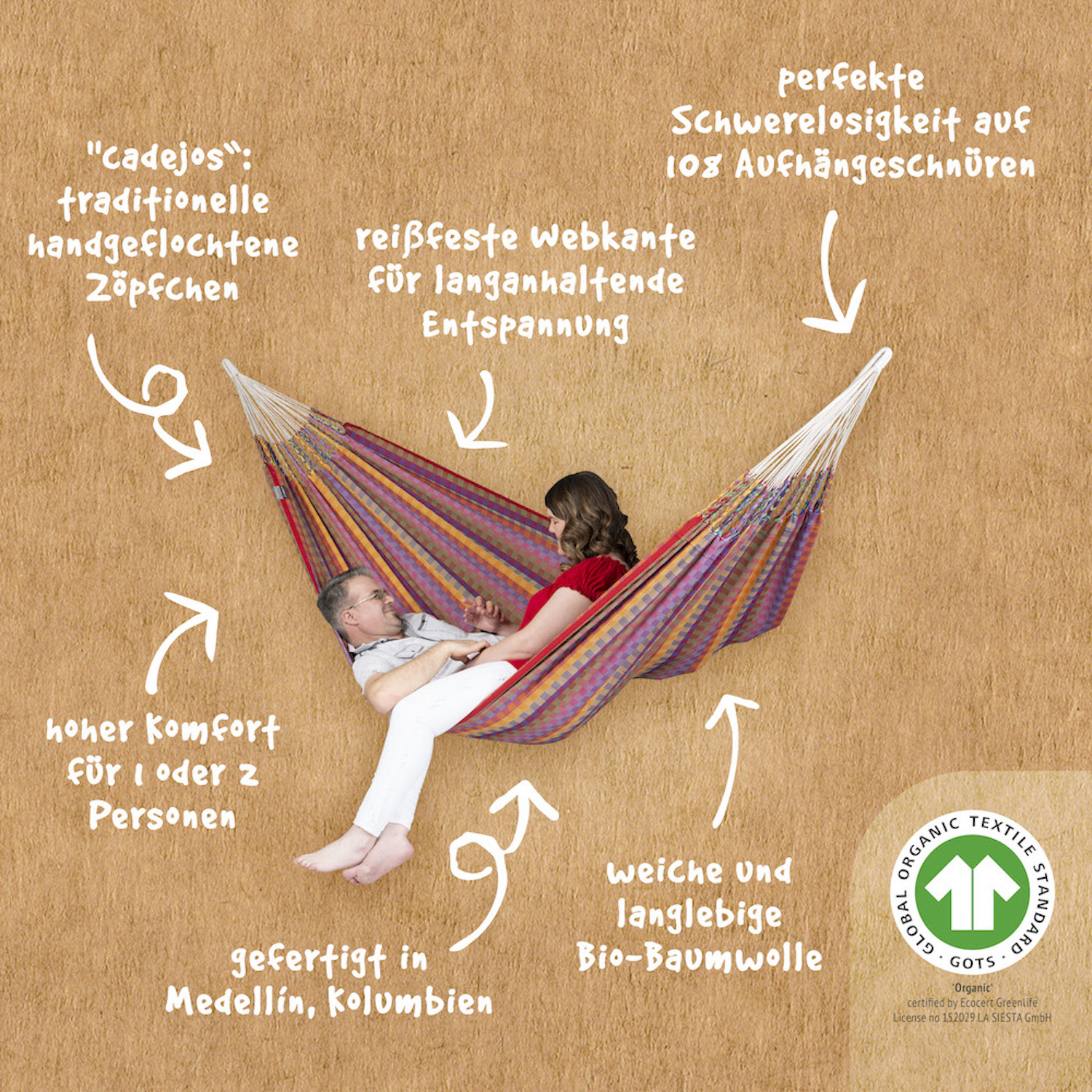 Ohne Spreizstab schmiegt sich die traditionelle südamerikanische Hängematte optimal an den Körper an und überzeugt durch ihren geringen Platzbedarf. Die hohe Anzahl ihrer Aufhängeschnüre garantiert eine optimale Gewichtsverteilung. Tipp: Am bequemsten liegt man möglichst quer darin – so wird der Rücken am besten unterstützt und die Hängematte wird vom Körper geöffnet.