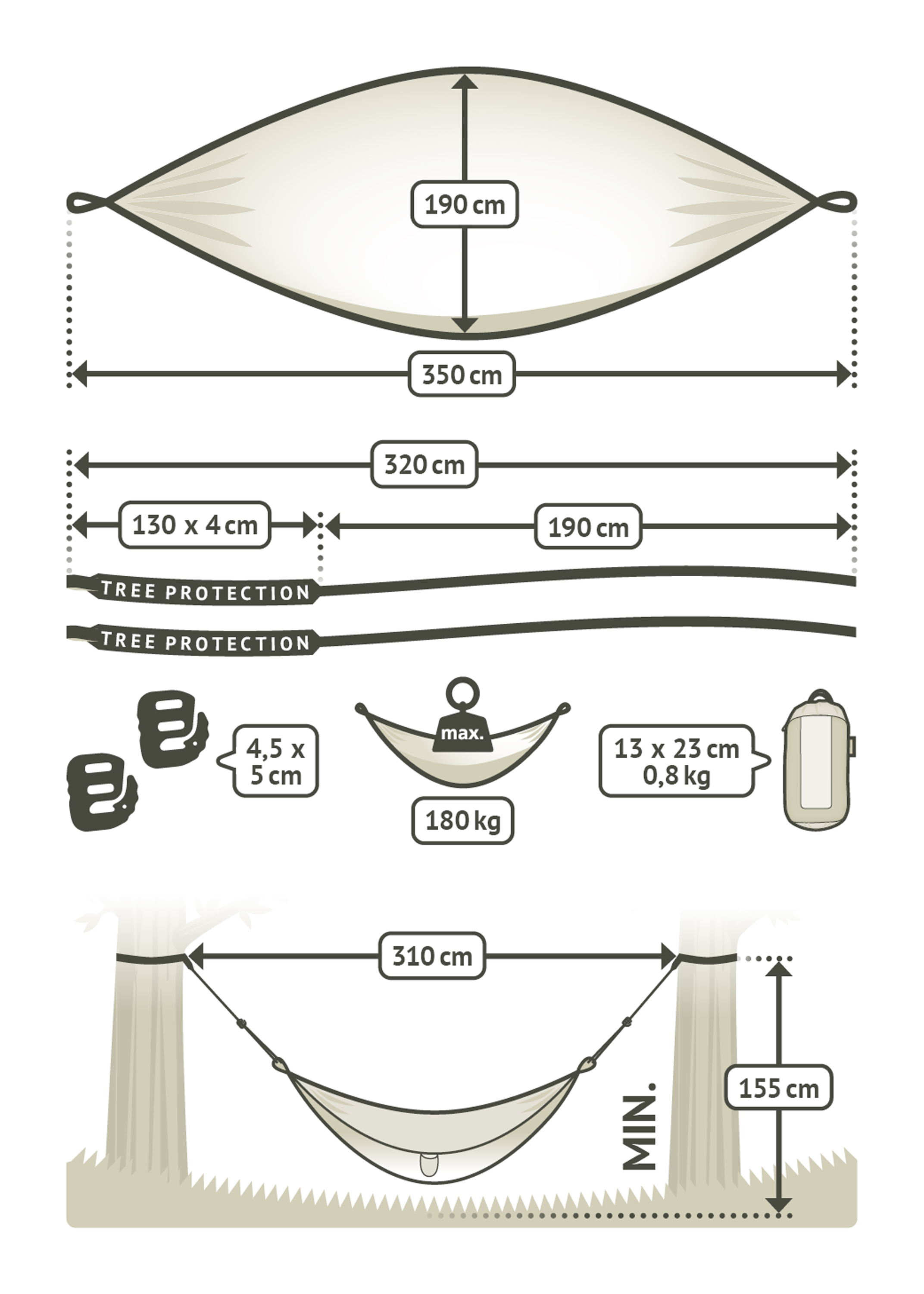 - inklusive Befestigungsmaterial (2x Baumgurt (ca. 130x4 cm), 2x Haken und 2x Seil)