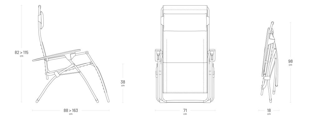Multipositions-Relaxsessel mit Clips - Gestell: HLE-Stahlrohr (hohe Elastizitätsgrenze) Ø 20 mm. 100 % Polyesterlackierung mit hoher UV-Beständigkeit. - Bezug: Batyline® ISO. Abnehmbarer und austauschbarer Bezug, der mit Clips aus Elastomer befestigt wird (LAFUMA MOBILIER Patent). - Position "Schwerelosigkeit": Die Beine befinden sich leicht über Herzhöhe und bilden so einen Winkel von 127 °, um optimale Entspannung zu gewährleisten. - Armlehnen aus Kunstharz, Positionseinstellung mit Stabilisatoren. - Verstellbare und abnehmbare Kopfstütze. - Schutzring Fußstützen und hochstabile Bodenschoner.