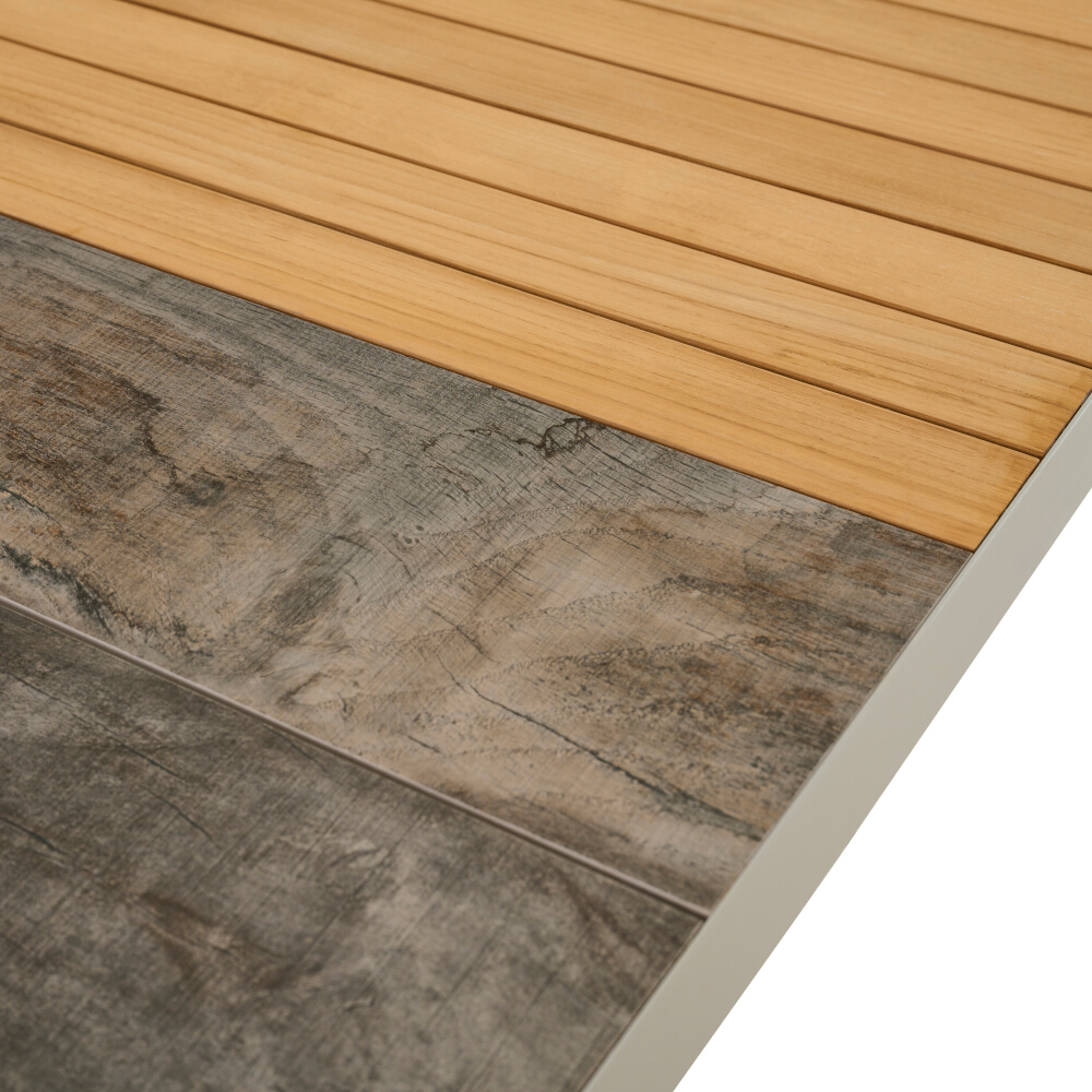 Die rechteckige Tischplatte aus Keramik in washed grau und einer Tischplatten-Einlage in Teak ist besonders robust, kratzfest sowie hitze- und witterungsbeständig – ideal für den täglichen Einsatz im Außenbereich. Das stabile Gestell aus pulverbeschichtetem Aluminium in seidengrau sorgt für eine hohe Standfestigkeit und Langlebigkeit.