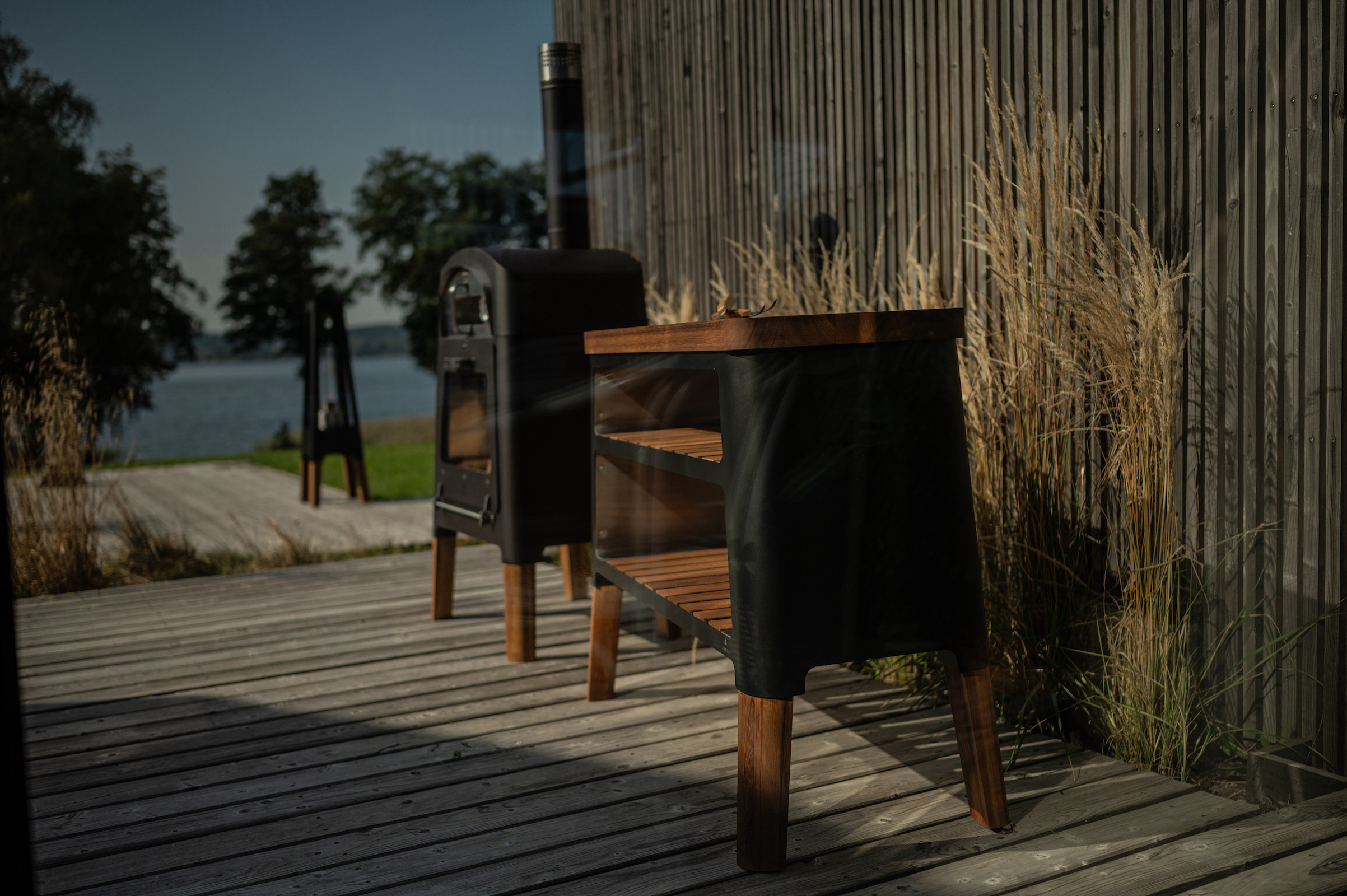 Der Kamin Nexo Black wurde mit einer feuerfesten Farbe lackiert, wodurch er gegen hohe Temperaturen beständig und zugleich wetterfest ist. Die Türen des Kamins und des Backmoduls sind mit hitzebeständigem Glas ausgestattet, das bis zu 800 Grad Celsius standhält. Sie sorgen für Sicherheit und ermöglichen es Ihnen, die Schönheit des Feuers zu genießen. Diese Lösung ermöglicht eine größere Wärmeabgabe, welche die Umgebung an kalten Abenden erfüllt. Die Standfüße aus dauerhaftem und massivem exotischem Holz, die mit natürlichem Öl geschützt sind, verleihen dem Kamin die Eleganz.