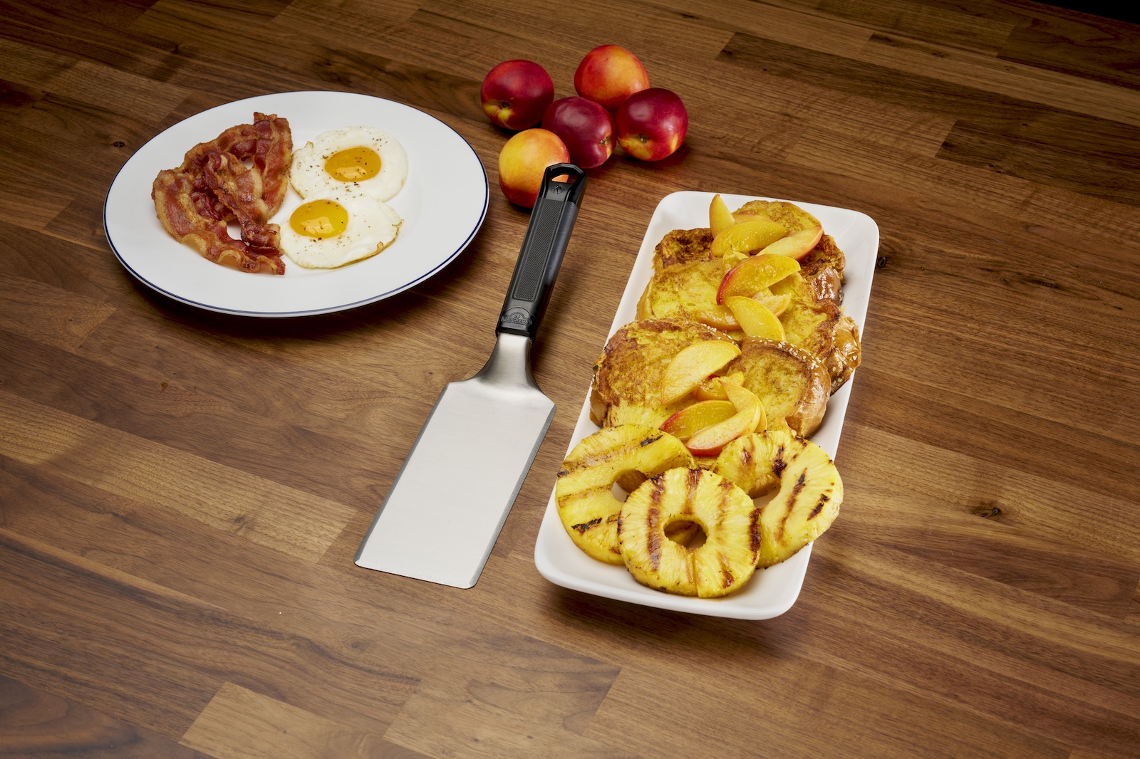 - Zum einfachen Wenden, Schieben und Servieren von Speisen direkt von der Grillplatte