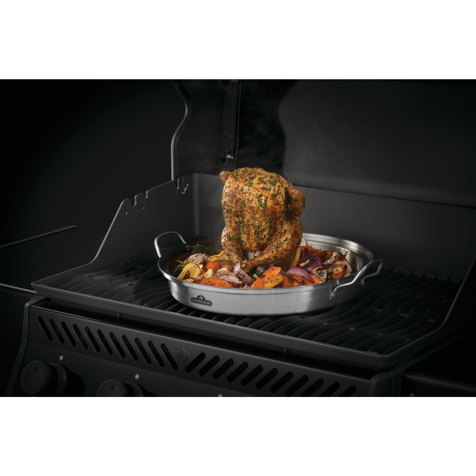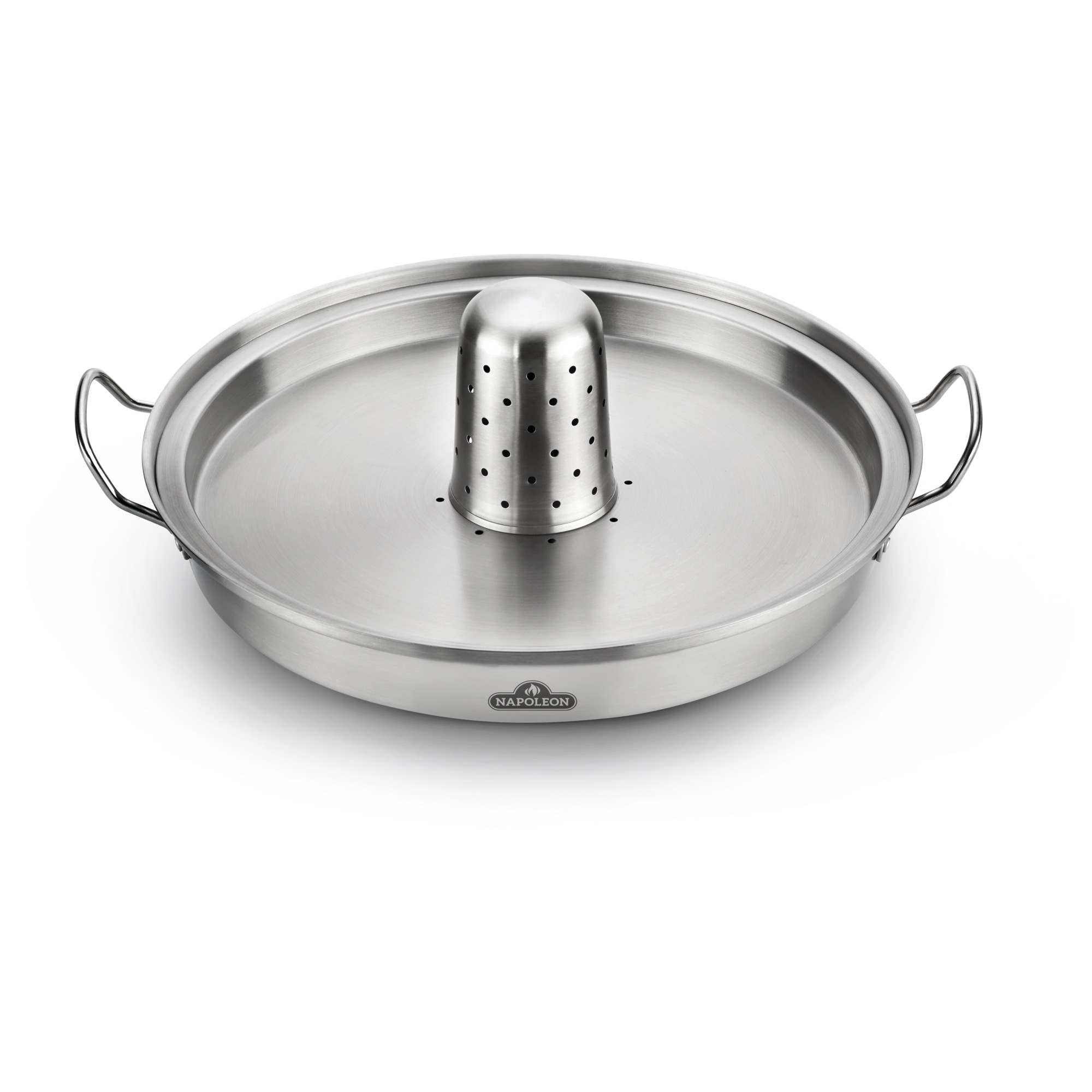 Der Napoleon PRO Edelstahl Hähnchenbräter bietet maximalen Komfort bei der Zubereitung eines klassischen Bierdosenhähnchens. Besonders praktisch: Während des Grillens lassen sich auf dem Deckel der großen Edelstahlpfanne zusätzlich leckere Beilagen wie Gemüse, Kartoffeln und andere Leckereien zubereiten.
