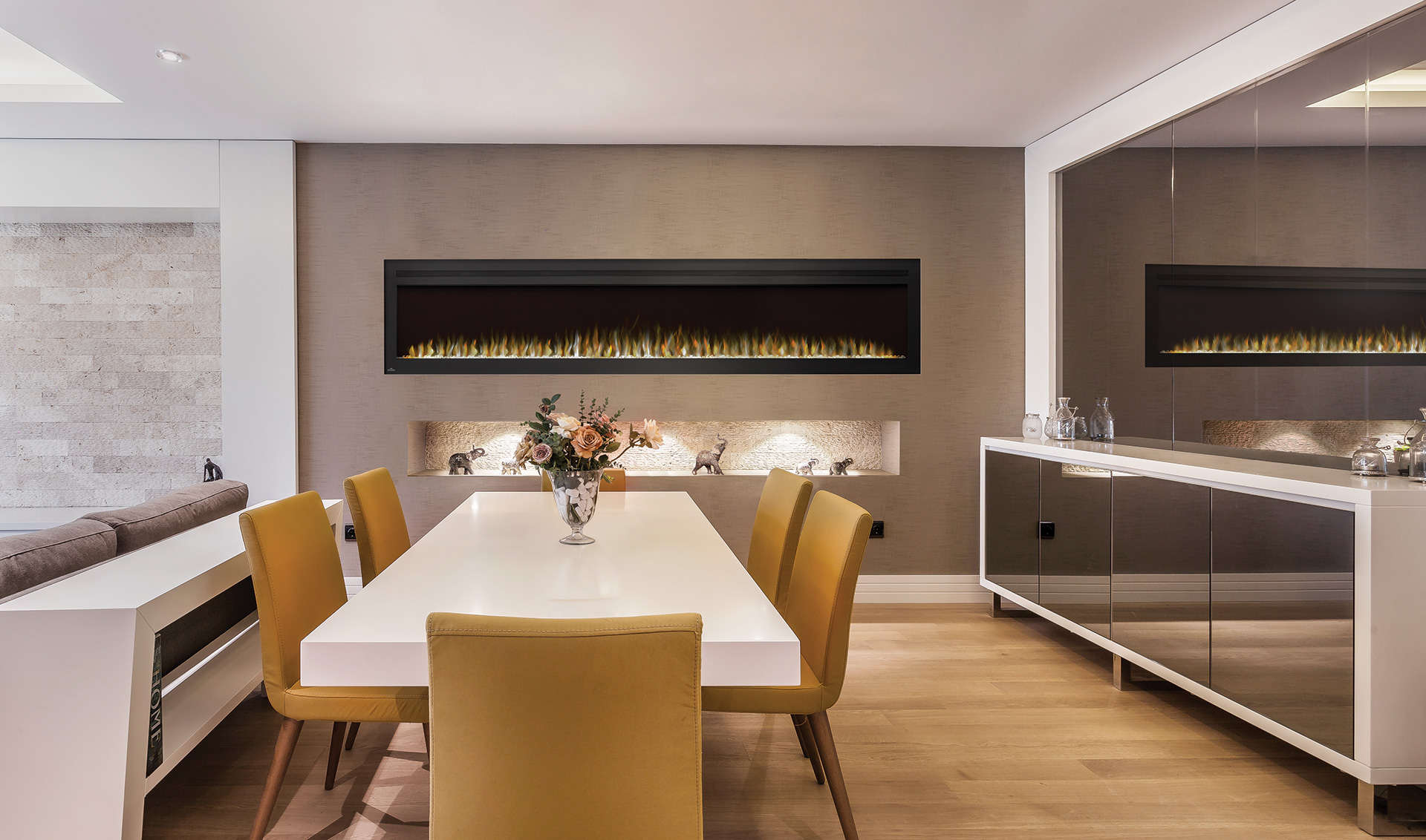 Sie leben in großen Räumen? Dann ist der Napoleon Premium Fire Elektrokamin PURVIEW 100 ideal für Sie geeignet. Mit einem faszinierenden Flammenspiel auf einer Breite von 254 Zentimetern bietet Ihnen der Elektro-Kamin PURVIEW 100 die größte Bildfläche dieser Serie und zählt zu den überdurchschnittlich großen Elektro-Kaminen. Hervorragend zur Geltung kommen die prächtigen Flammenfarben und die herrlichen Lichteffekte des elektrischen Kamins auf einer freien Wandfläche von 3 bis 4,5 Metern, zum Beispiel in einem größeren Wohn- oder Esszimmer genießen Sie mit dem modernen Elektrokamin von Napoleon allein, zu zweit, im Kreis der Familie oder mit Freunden und Gästen ein entspannendes Flair. In Restaurants, Bars oder an der Hotelrezeption ist der Elektrokamin PURVIEW 100 ein besonderer Hingucker.