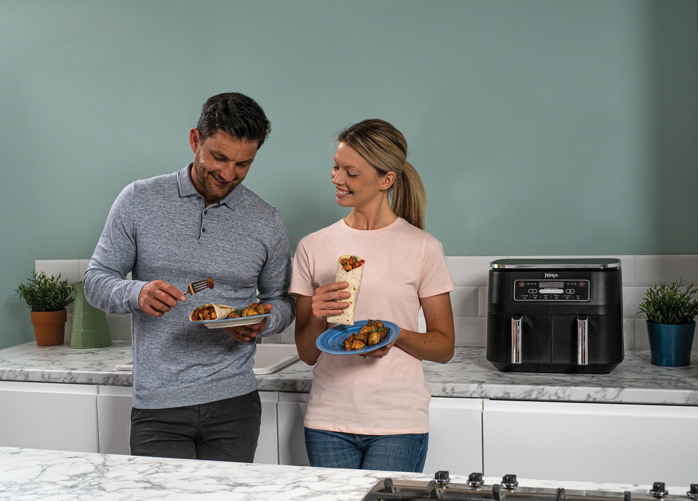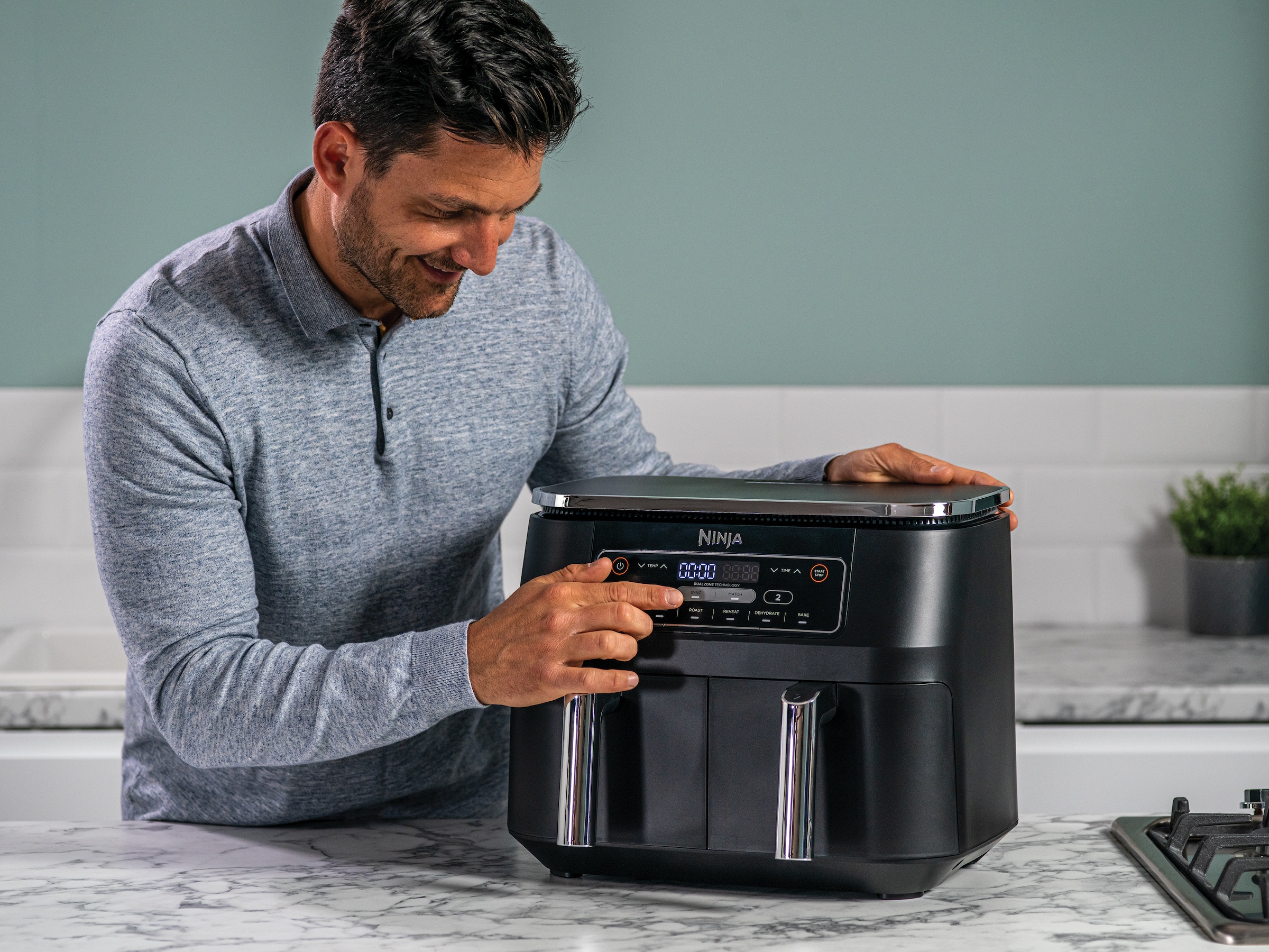 Beim Kochen ist Timing alles. Die Ninja Foodi Dual Zone Heißluftfritteuse mit 7,6 l Fassungsvermögen unterstützt Sie dabei, Ihre Mahlzeit auf den Punkt zuzubereiten und gleichzeitig zu servieren.