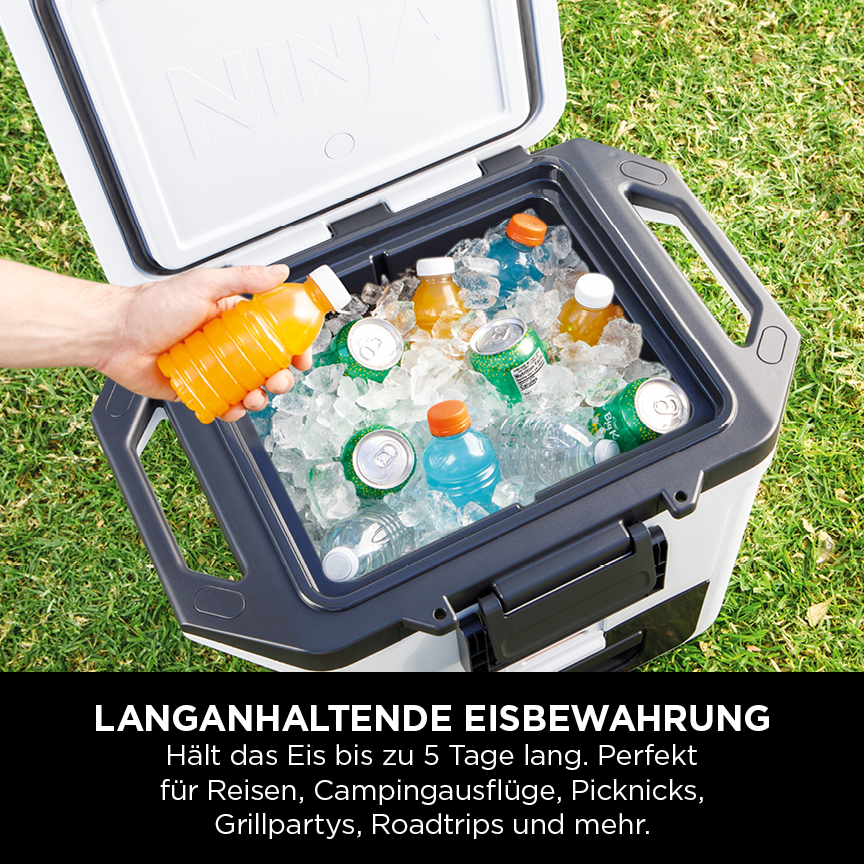 Lernen Sie die Ninja FrostVault kennen, die Kühlbox mit erstklassiger Eisspeicherung und trockener Lagerung bei Kühlschranktemperatur für mehrere Tage. Die Ninja Kühlbox hält das Eis bis zu 6 Tage lang kalt. Perfekt für Campingausflüge, Picknicks und alle weiteren Outdoor-Abenteuer. Die große Kapazität von 28 Litern bietet Platz für bis zu 48 Dosen ohne Eis oder 26 Dosen mit Eis. Ausreichend Platz für all Ihre Lieblingsgetränke, von Bier oder Wein bis zu Wasser und Softdrinks.