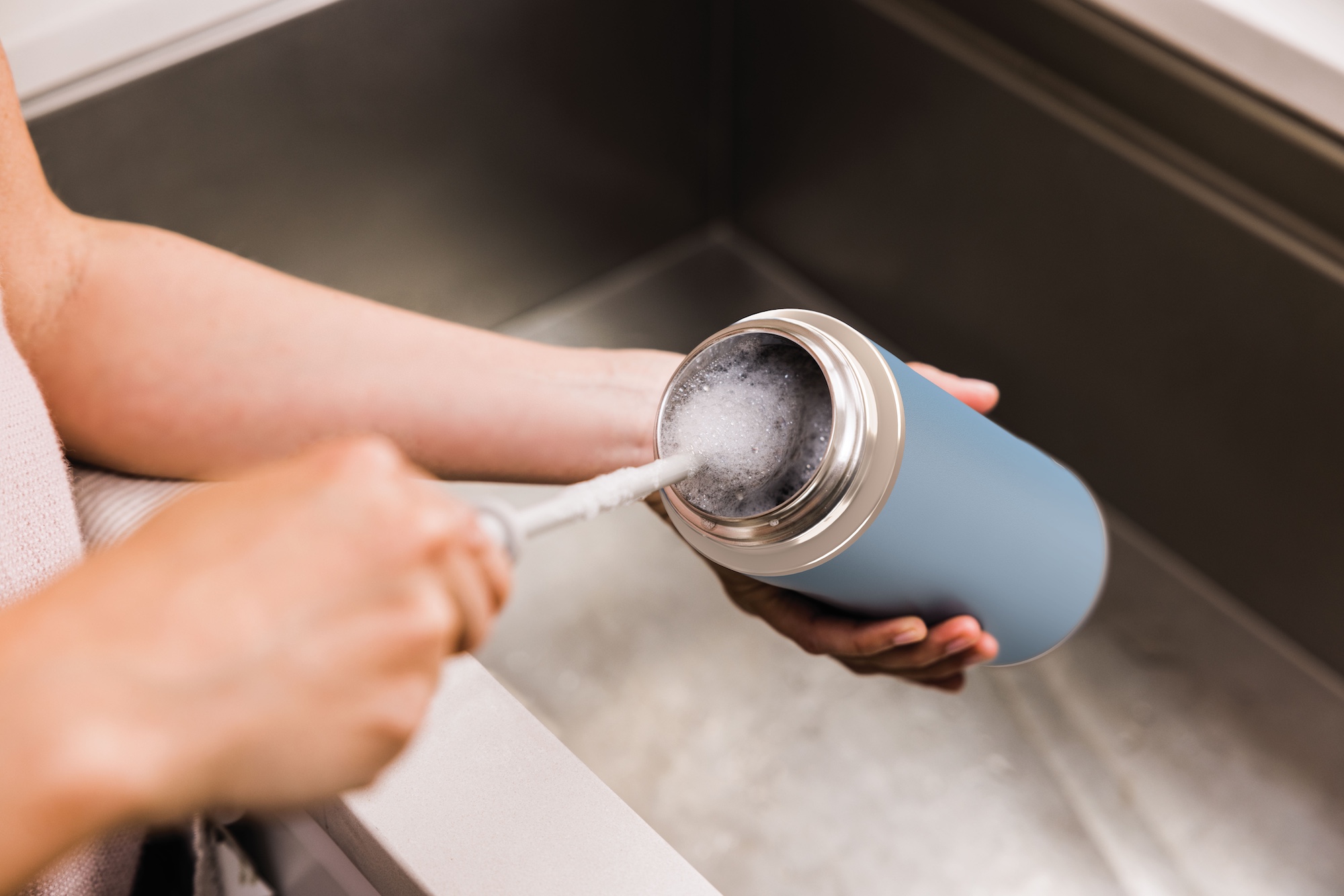 Geben Sie Ihre Trinkflasche bei Bedarf einfach in die Spülmaschine. Um sie in Topform zu halten, spülen Sie sie per Hand in warmem Seifenwasser. Für eine gründliche Reinigung können Sie die Dichtungen vom Deckel entfernen und per Hand spülen.