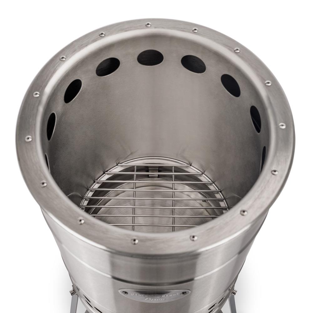 Durch die spezielle Konstruktion der Pyron Feuertonne sorgt ein Kaminzugeffekt zusammen mit dem Holzvergaserprinzip für eine besonders saubere und rußfreie Verbrennung. Der doppelwandige Aufbau in Verbindung mit den Lüftungslöchern ist für eine optimale Luftzufuhr und damit einen effizientere Verbrennung des Holzes verantwortlich. Im Inneren befindet sich ein Kohlerost, auf dem das Feuerholz platziert wird, mit einer darunterliegenden Ascheschale, in der die Verbrennungsrückstände aufgefangen werden. Diese Trennung von Feuer und Asche sorgt dafür, dass das Feuer nicht langsam an den Rückständen ersticken kann. Zur leichten Reinigung lässt sich die Ascheschale einfach entnehmen.
