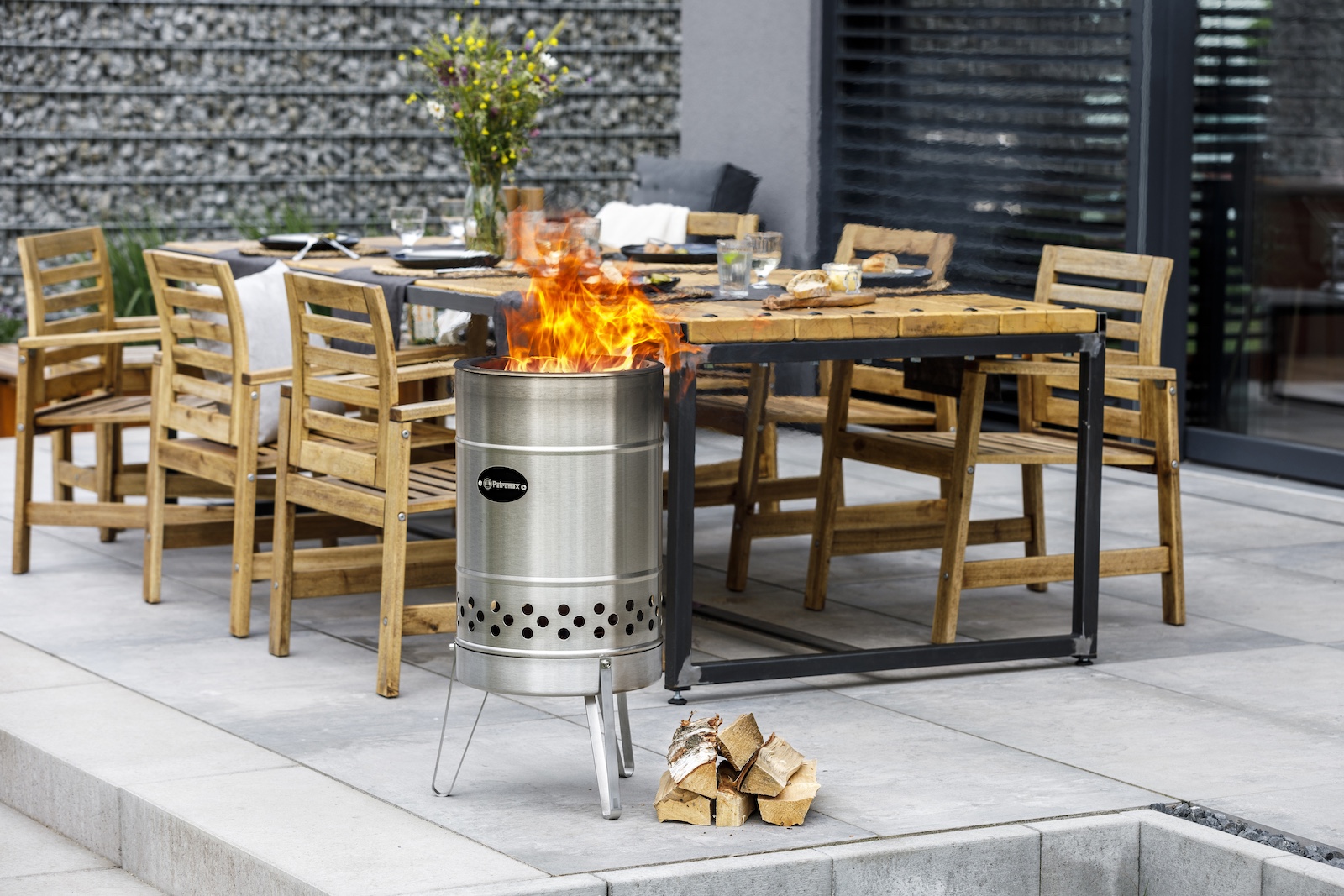 - Stabile Edelstahl Feuertonne im rustikalen Industriedesign