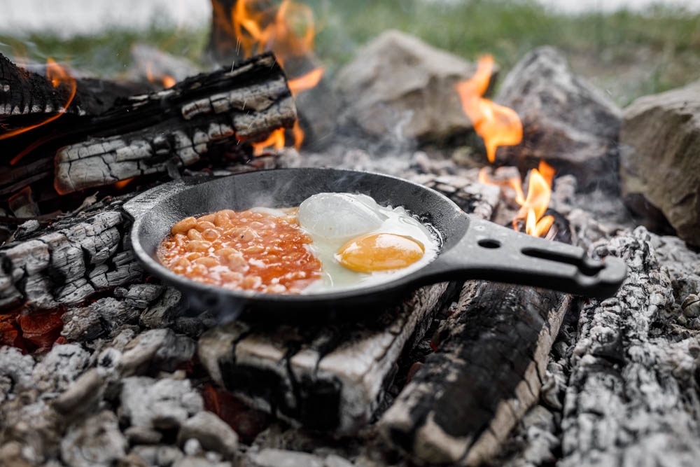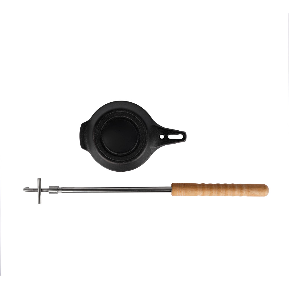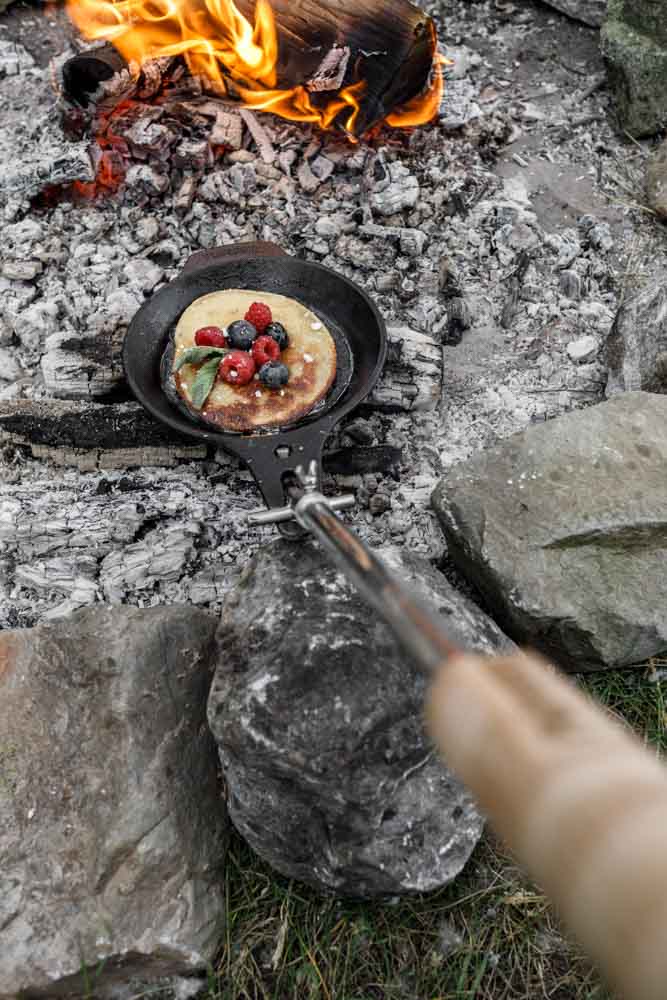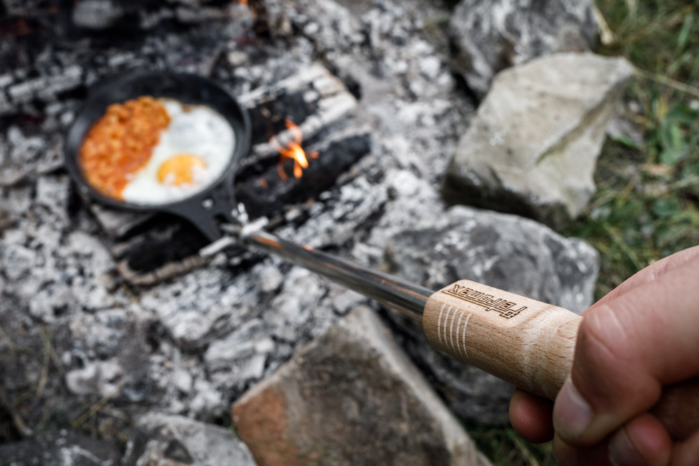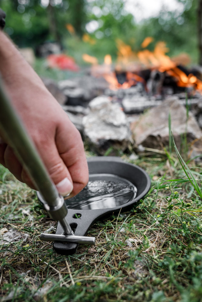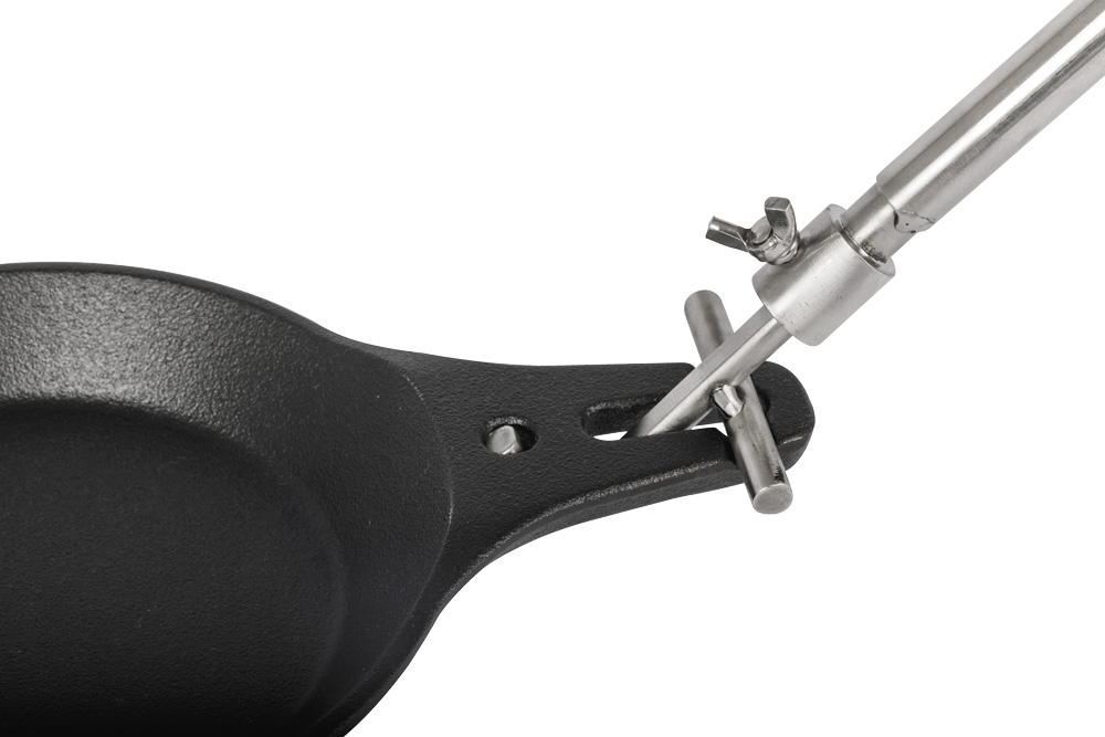 Gusseisen besitzt die perfekten Eigenschaften für die Verwendung in der Glut eines Lagerfeuers. Das Material ist extrem hitzebeständig, bietet eine besonders gleichmäßige Hitzeverteilung und eine langanhaltende Hitzespeicherung. So bleiben die Gerichte auch nach der Zubereitung noch lange warm. Mit dem stabilen, langen Teleskopstiel kann die Pfanne komfortabel und sicher im Glutbett positioniert werden, ohne dem Feuer oder der Glut zu nahe zu kommen. Der Stiel lässt sich mithilfe einer Flügelschraube auf eine Länge von 58 bis 95 cm verstellen und mit einem Haken bequem an der Pfanne einhängen und auch wieder abnehmen. Eine Querstrebe am Stiel hält die Pfanne fest im Griff.