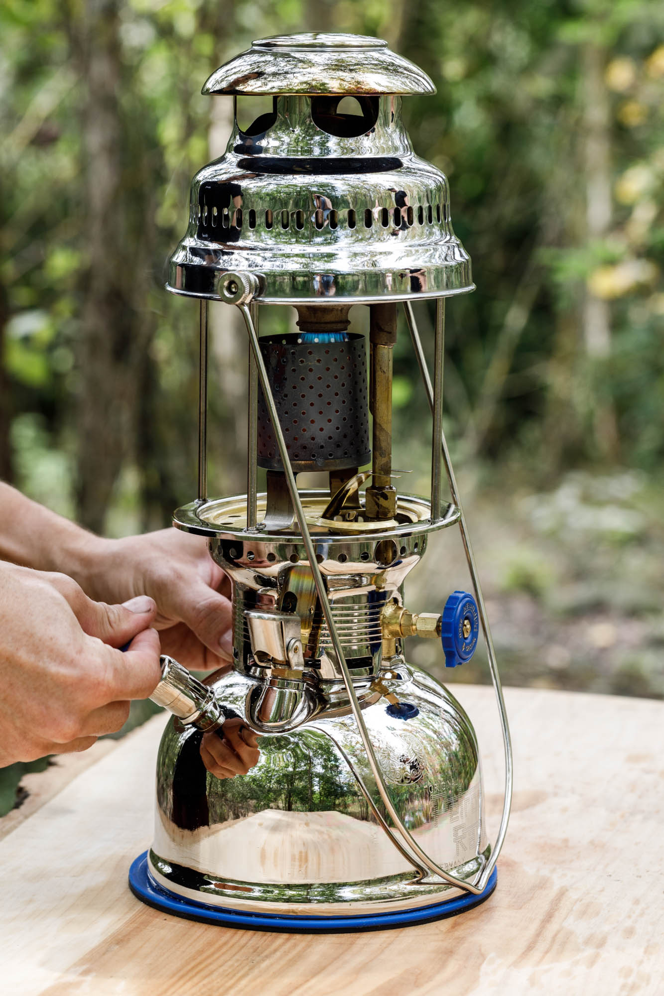Die hervorragende Lichtleistung der Petromax Lampe kommt durch ein einfaches, aber faszinierendes Prinzip zustande: Petroleum wird unter Druck in einen Vergaser geleitet, der dadurch verdampfende Brennstoff reagiert in einem mit Leuchtsalzen imprägnierten Glühstrumpf zu einem hellen, warmen Licht. Damit dieses Prinzip einwandfrei funktioniert, wird die aus über 200 Einzelteilen bestehende Lampe nach wie vor in Handarbeit zusammengesetzt.