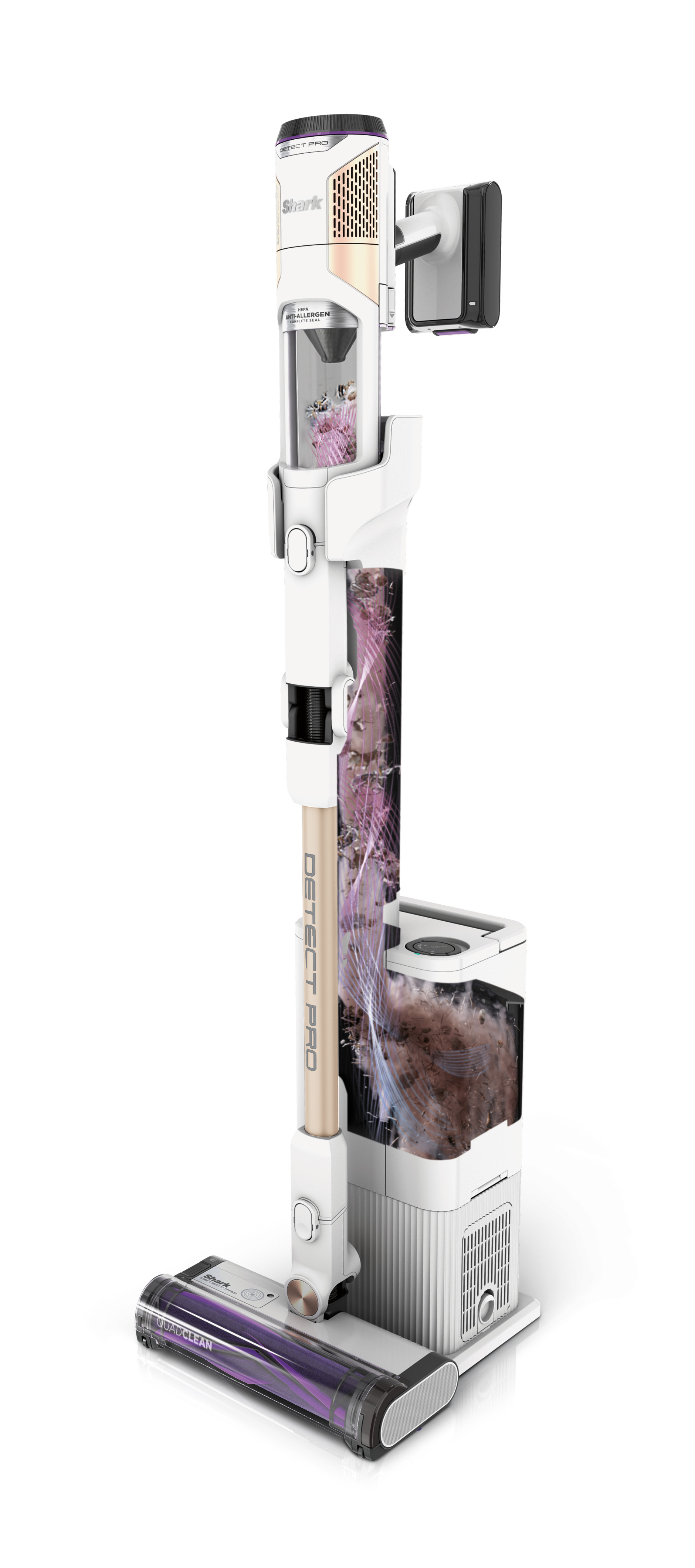 Der extragroße, beutellose 2-Liter-Behälter mit automatischem Entleerungssystem kann den Schmutz von bis zu 45 Tagen aufnehmen. Docken Sie den Staubsauger nach dem Reinigen einfach an der Basis an und er entleert sich automatisch, immer und immer wieder.