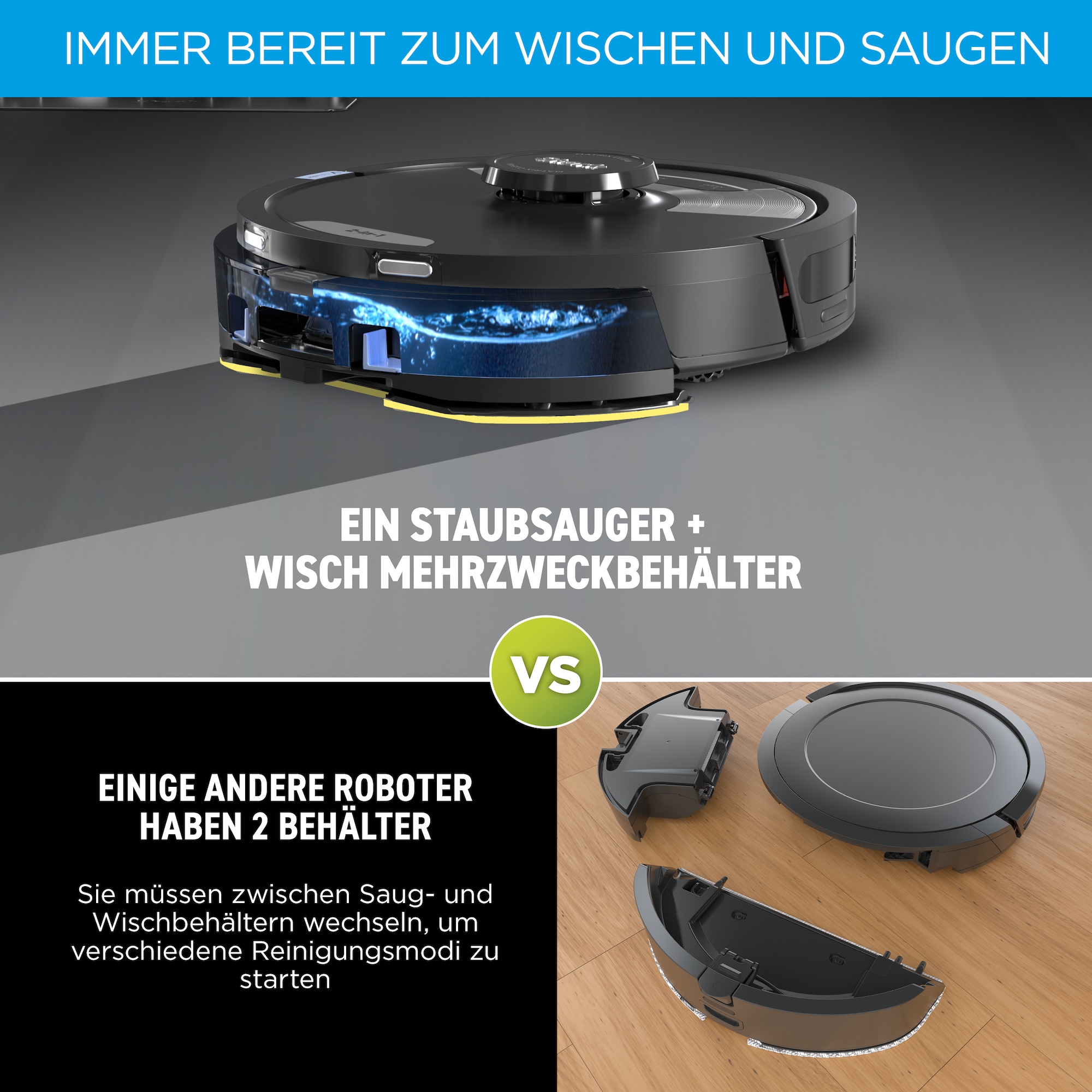 - Saug- und Wischroboter für versiegelte Hartböden, einschließlich Holz, Fliesen und Laminat
