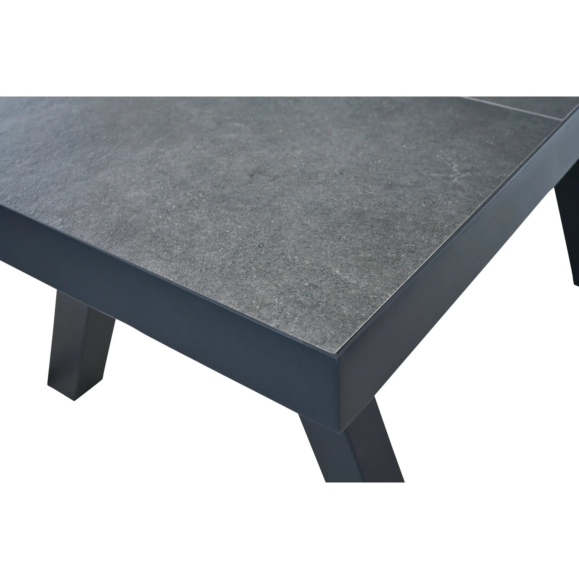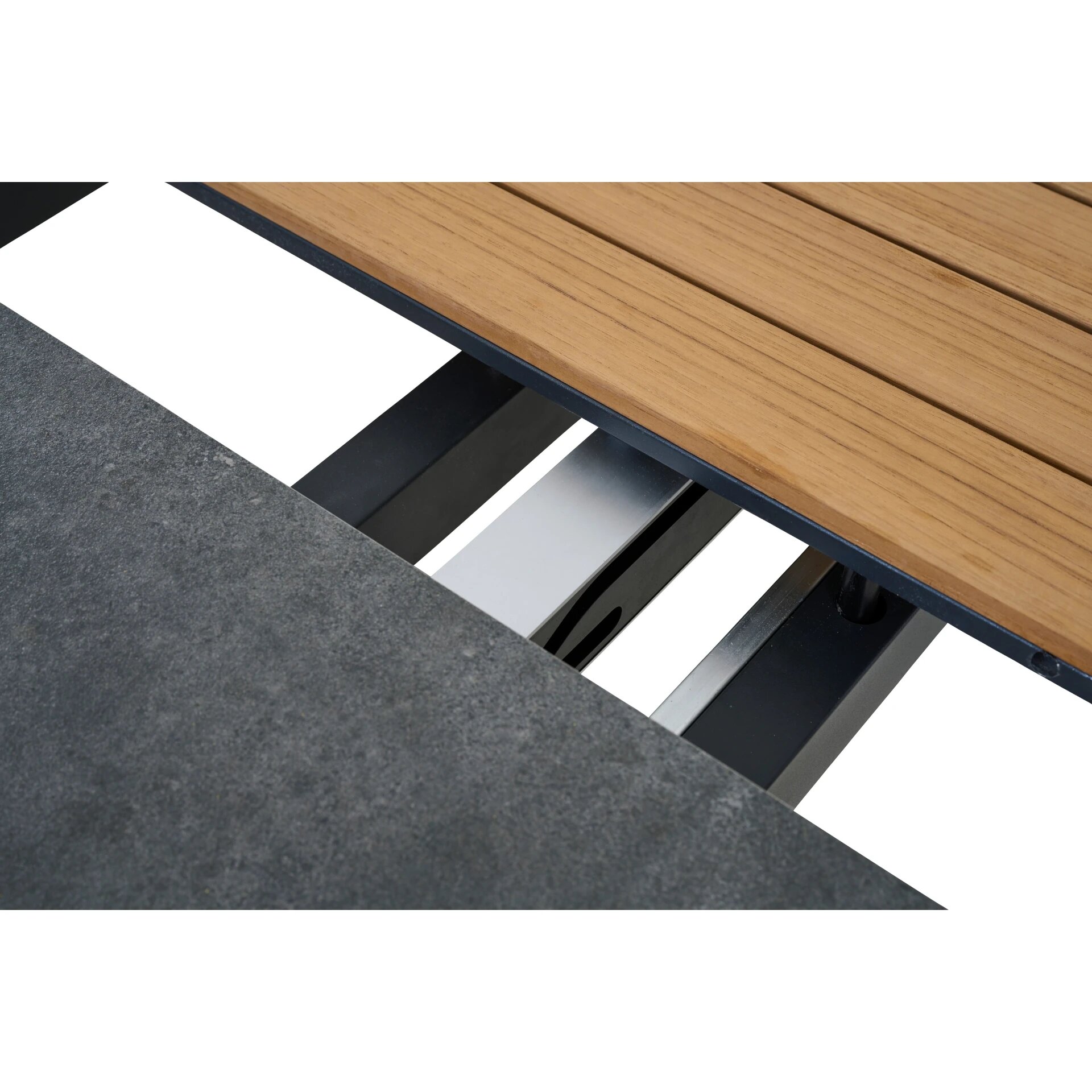Die Tischplatte aus edler Keramik in Anthrazit vereint Ästhetik und Widerstandsfähigkeit: kratzresistent, pflegeleicht und unempfindlich gegenüber Hitze, Frost und intensiver Nutzung. Die Mittelplatte wird durch ein exklusives Onlay in Teak ergänzt, das natürliche Wärme und Eleganz in das Design integriert. Der Unterbau aus rostfreiem Aluminium in mattem Anthrazit garantiert Stabilität, Wetterfestigkeit und eine ergonomische Unterschubhöhe von 65,5 cm. Verstellbare Fußkappen sorgen selbst auf unebenem Untergrund für perfekten Stand.