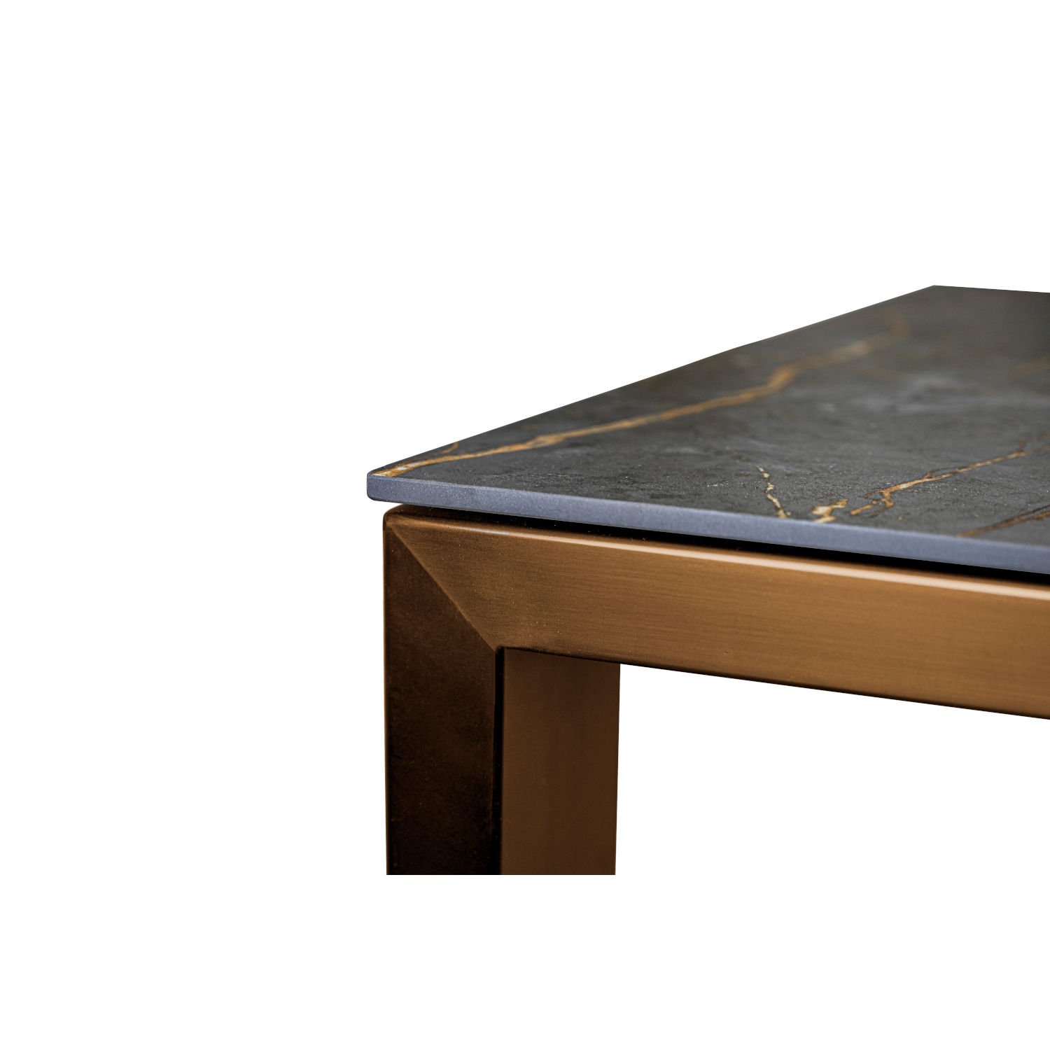 - Tisch: Gestell aus rostfreiem Edelstahl (100x40 mm, Zarge 50x25 mm), Kupfer/cobre verchromt mit einer Tischplatte aus Dekton Laurent