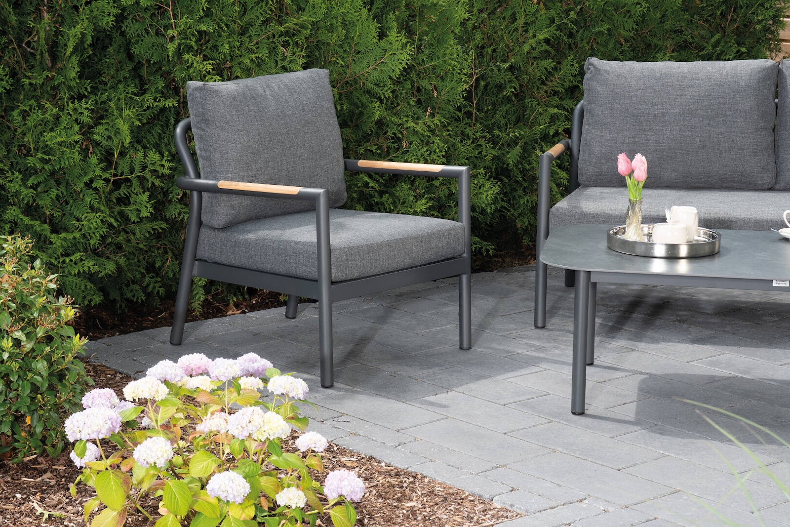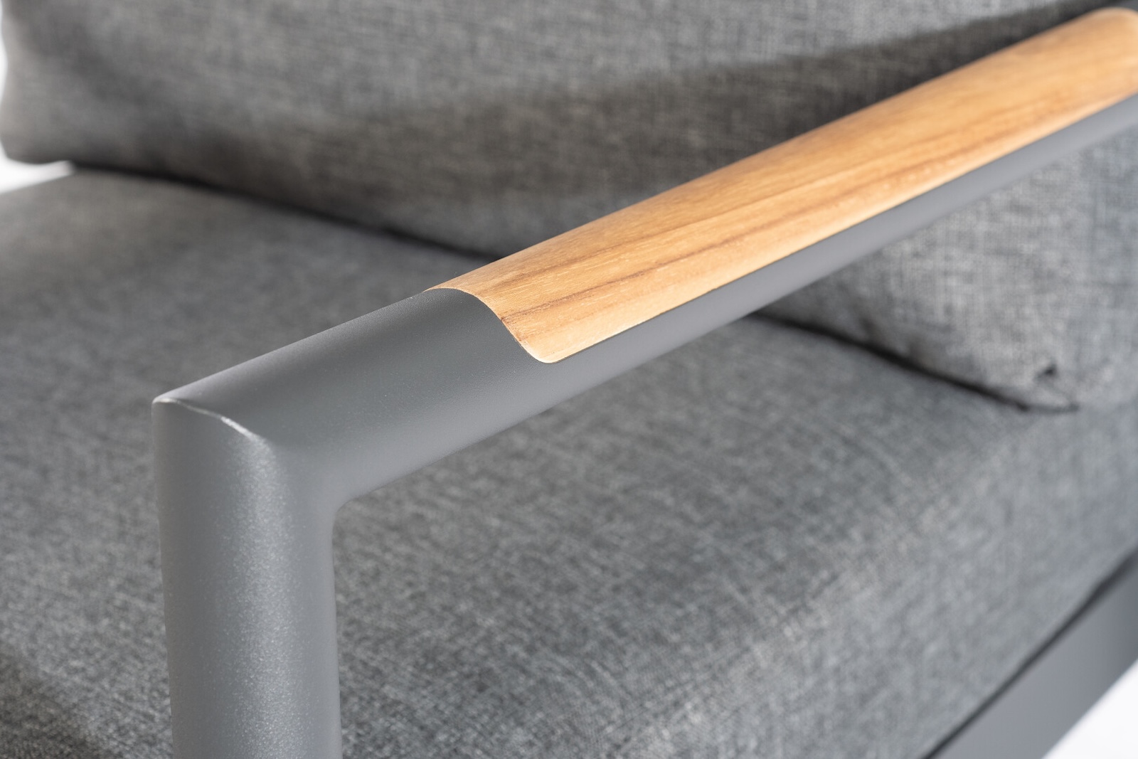 Das robuste Aluminiumgestell ist in einem edlen matt-anthrazitfarbenen Ton gehalten und sorgt für Stabilität sowie eine moderne, klare Linienführung. Besonders stilvoll wirken die eingearbeiteten Teakholzelemente in den Armlehnen, die dem Ensemble eine warme und natürliche Note verleihen und gleichzeitig einen harmonischen Materialkontrast schaffen.