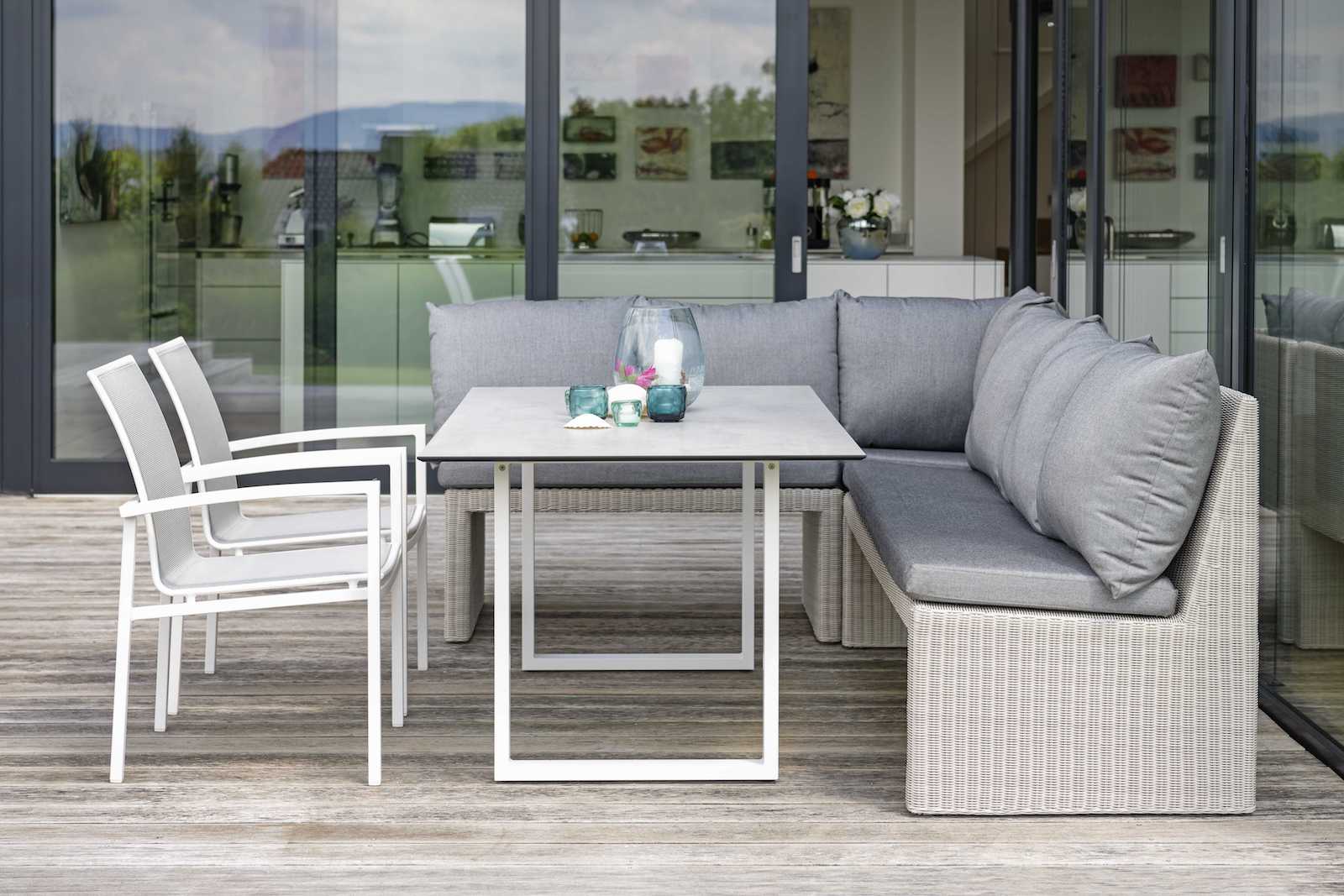 Die Dining-Sitzgruppe Noel & Skelby von Stern vereint Design und Komfort. Die Lounge-Sofas Noel aus weißem Geflecht sind gemütlich gepolstert und laden zum Verweilen ein. Die passenden Stapelsessel Skelby sind mit hochwertigem Textilen bespannt. Der große Kufentisch mit der Silverstar 2.0-Tischplatte bietet extra viel Platz für gesellige Stunden auf ihrem Balkon oder ihrer Terrasse.