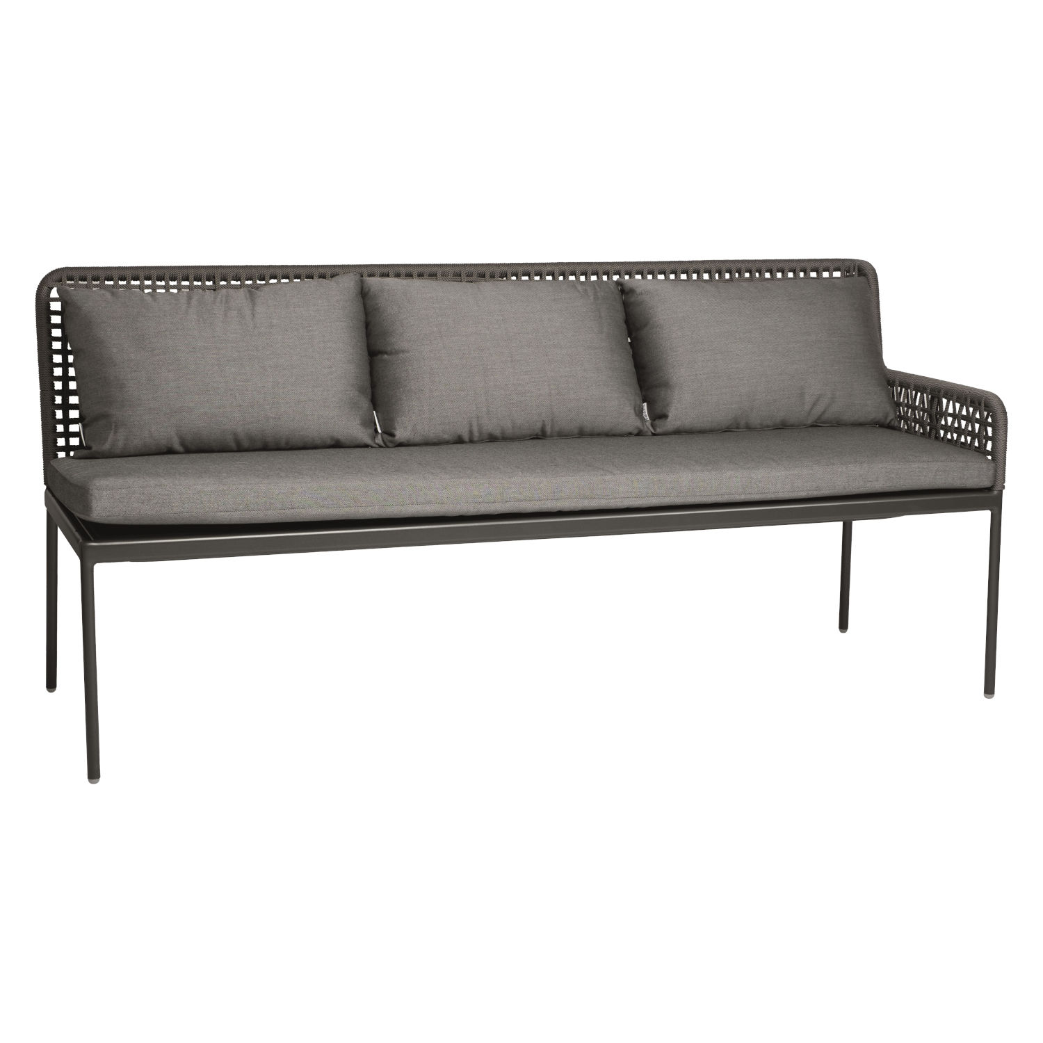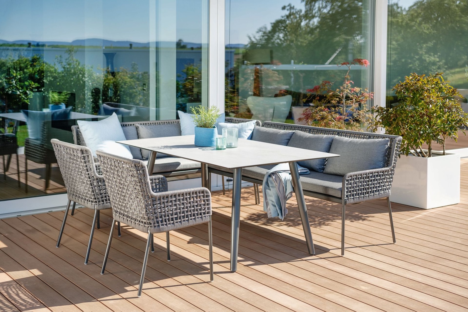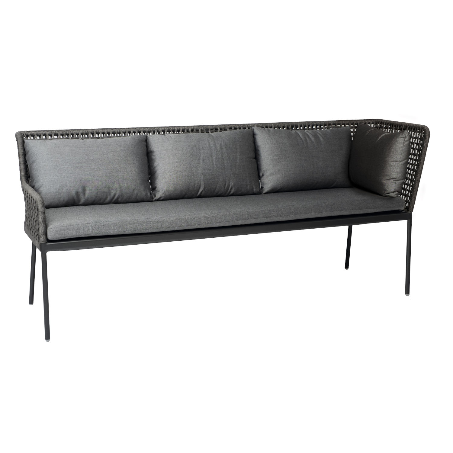 Die Dining-Sitzecke Greta von Stern vereint Design und Komfort. Die Bänke sind mit hochwertiger Synthetikfaser bespannt und laden zum Verweilen ein. Die gemütlichen Sitz- und Rückenkissen sorgen für höchstmöglichen Komfort.