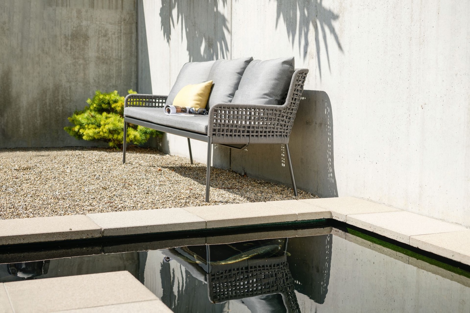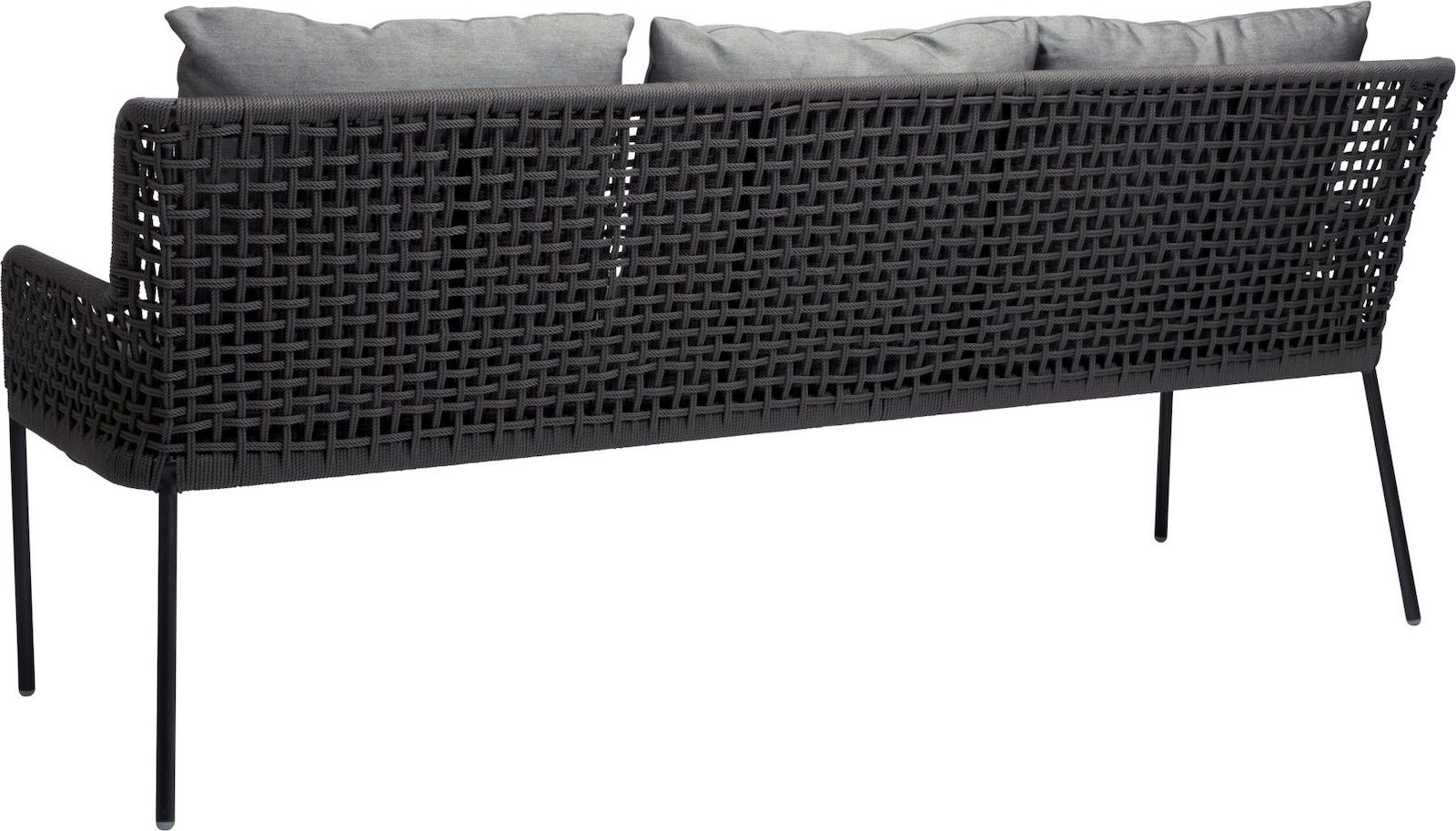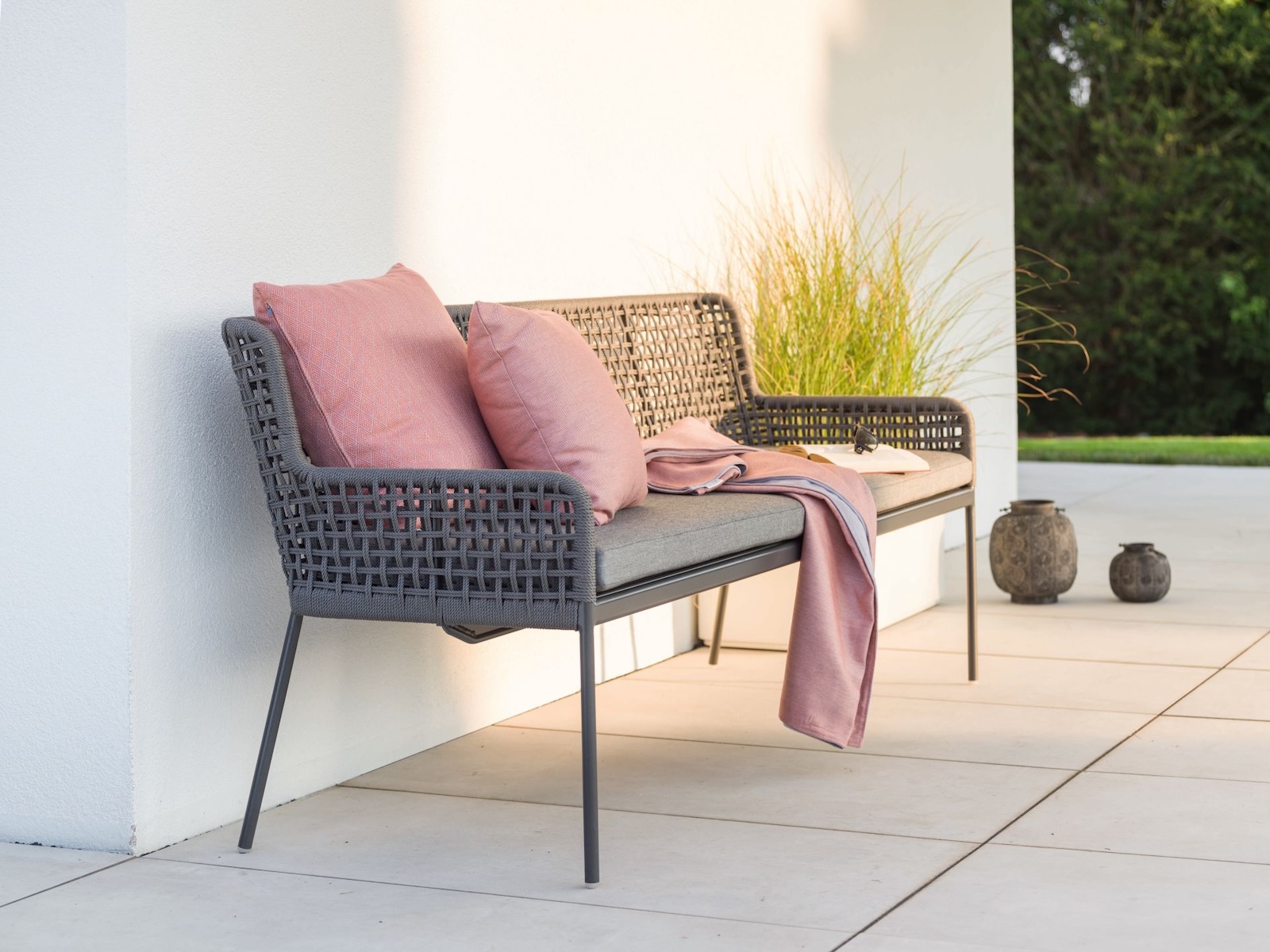 Die Greta 3-Sitzer Lounge-Bank verbindet modernes Design mit hohem Sitzkomfort. Das robuste Aluminiumgestell in Anthrazit sorgt für Stabilität und ist witterungsbeständig, während die dekorative Kordel in Platin an der Rückenlehne ein elegantes Detail setzt.