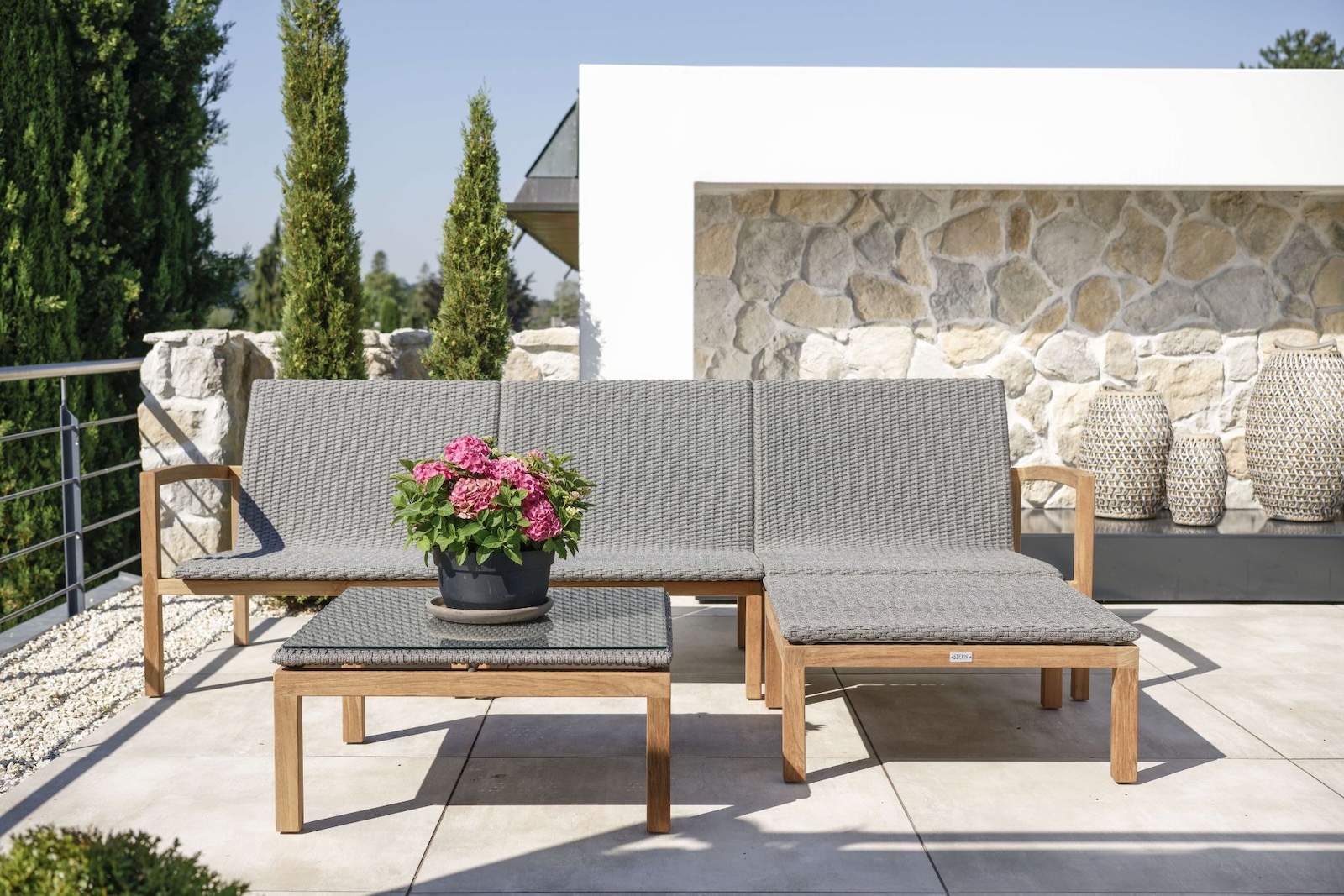 - Hochwertiges Teakholzgestell, langlebig und wetterbeständig