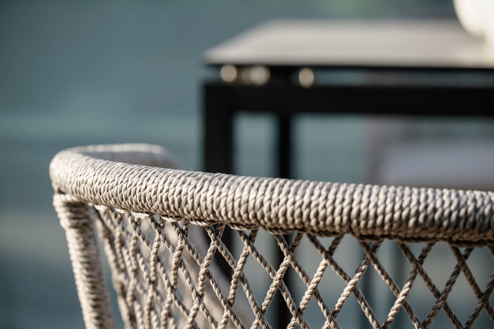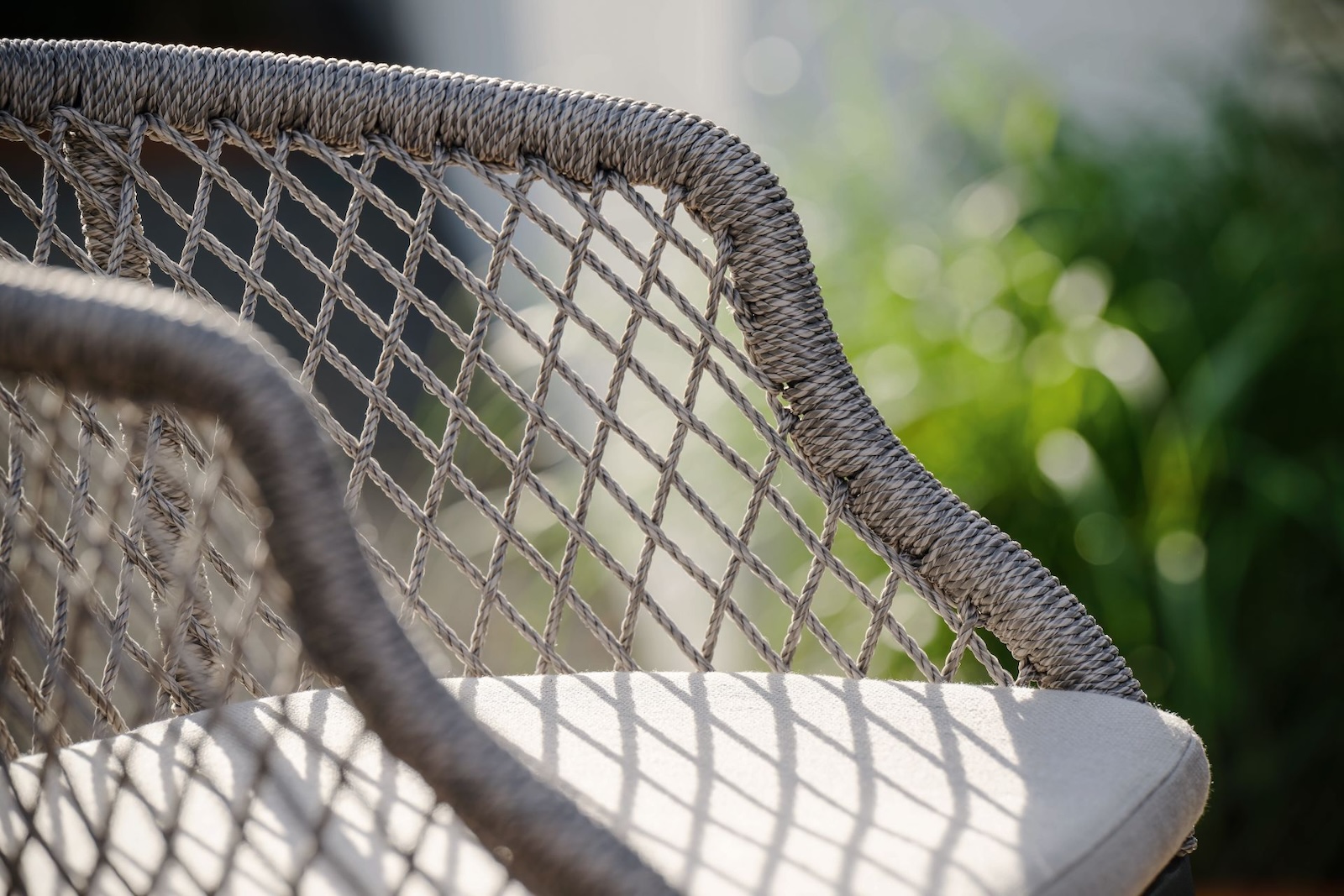 Die Sitzfläche aus strapazierfähigem Textilen gewährleistet Langlebigkeit und ein angenehmes Sitzgefühl – auch an warmen Sommertagen. Trotz seiner leichten Bauweise ist der Odea Barsessel robust und eignet sich hervorragend für den täglichen Einsatz im Außenbereich.