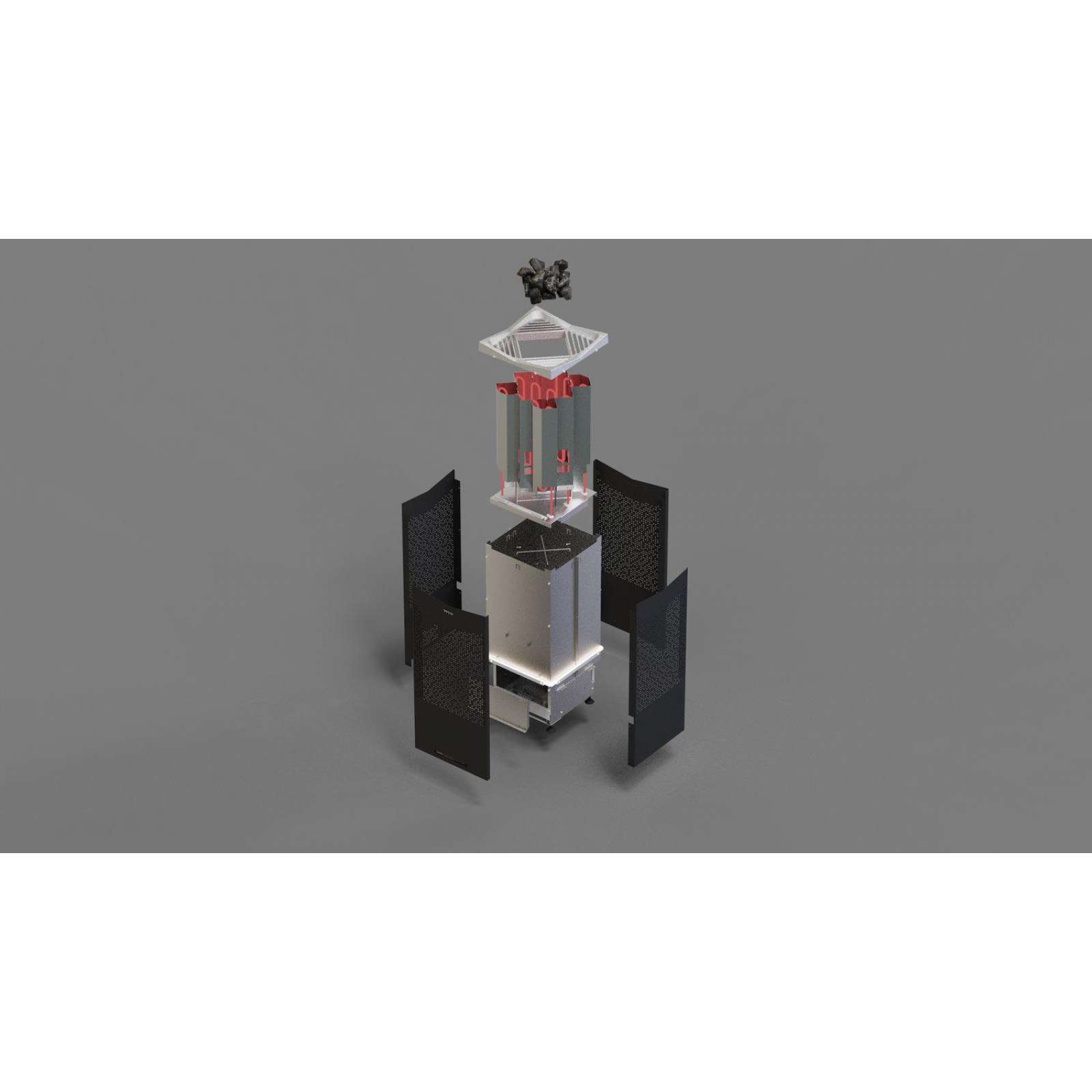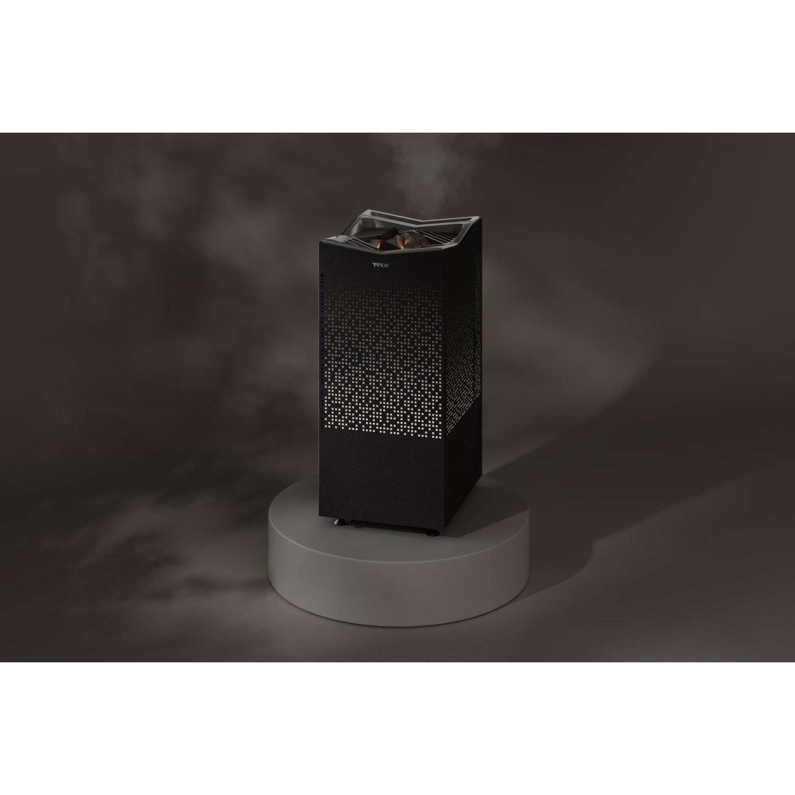 Der freistehende Saunaofen verfügt über ein symmetrisches Design, das mit einer eleganten Beleuchtung ein angenehmes Licht im Raum erzeugt und eine ruhige und entspannte Atmosphäre schafft. Der auffällige Crown-Grill gewährleistet eine optimale Luftzirkulation und eine gleichmäßige Wärmeverteilung in der Sauna, damit Sie die volle Leistungsfähigkeit des Ofens genießen können.