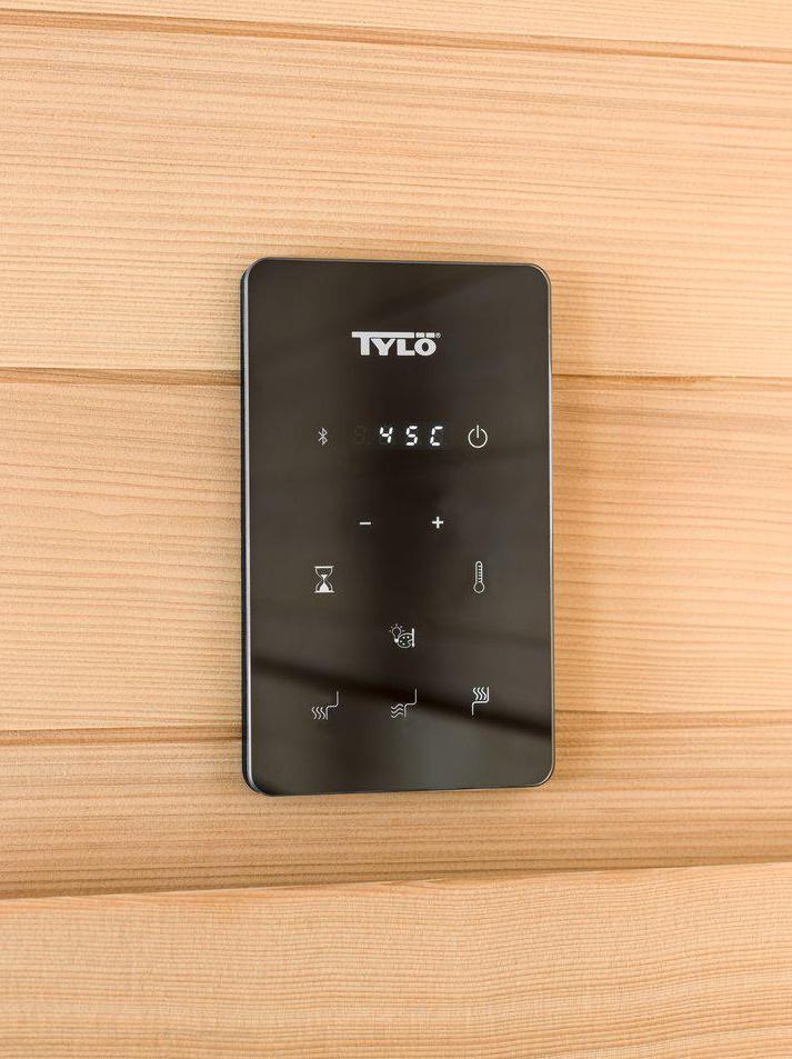 - Steuerung: Eingebautes Touch-Bedienfeld sowie über Smartphone/SaunaLogic-App