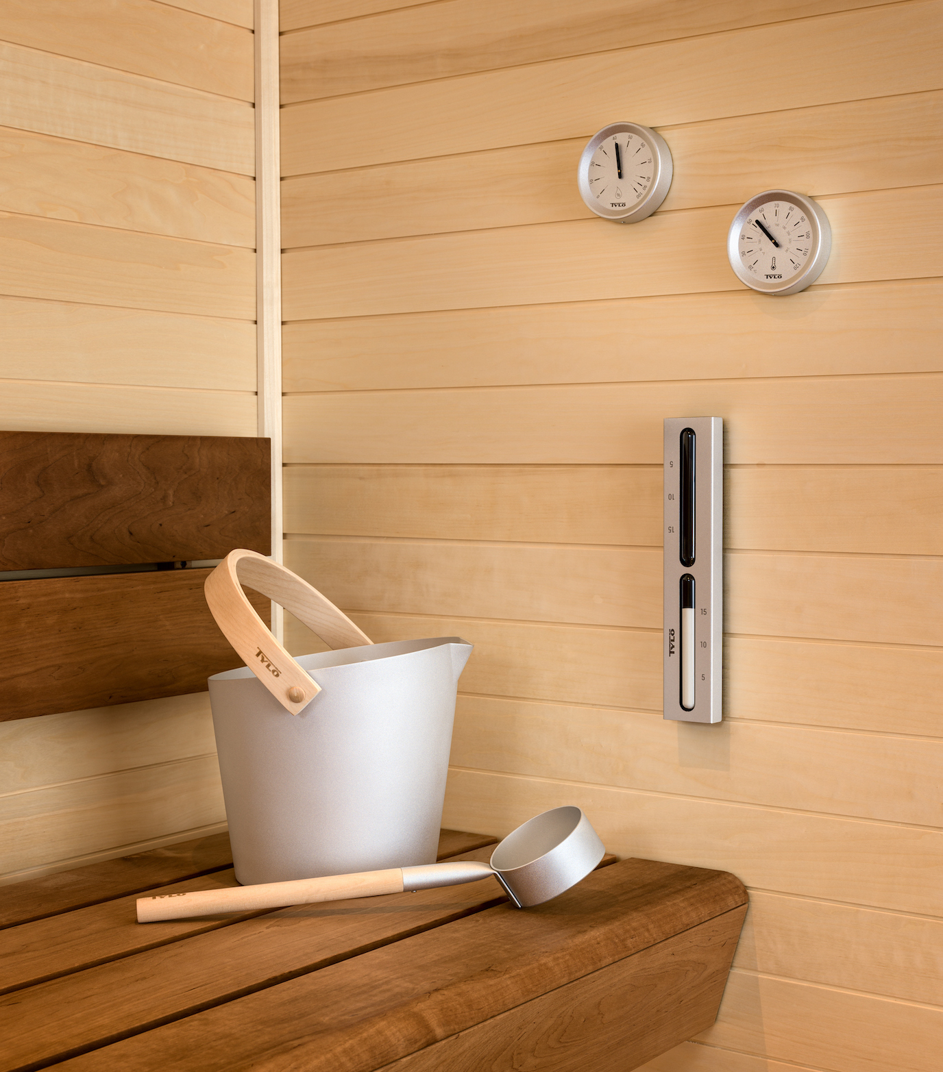 - Tylö Brilliant Silver Set: Saunakübel, Saunakelle, Thermometer, Hygrometer und Sanduhr